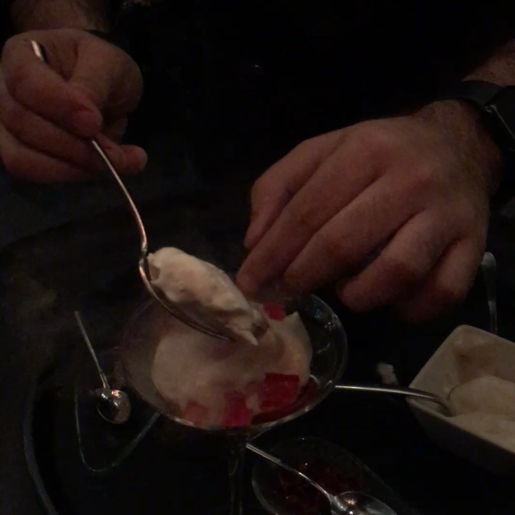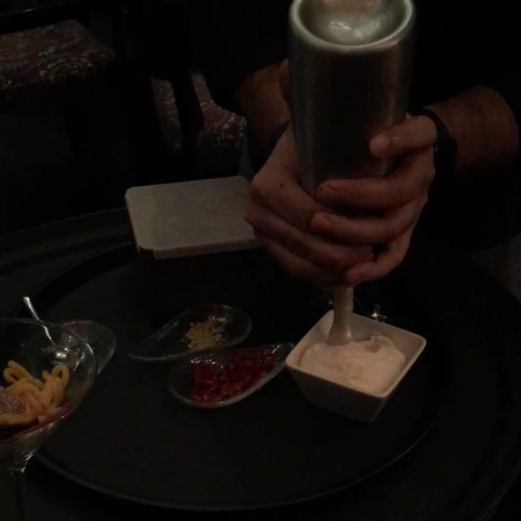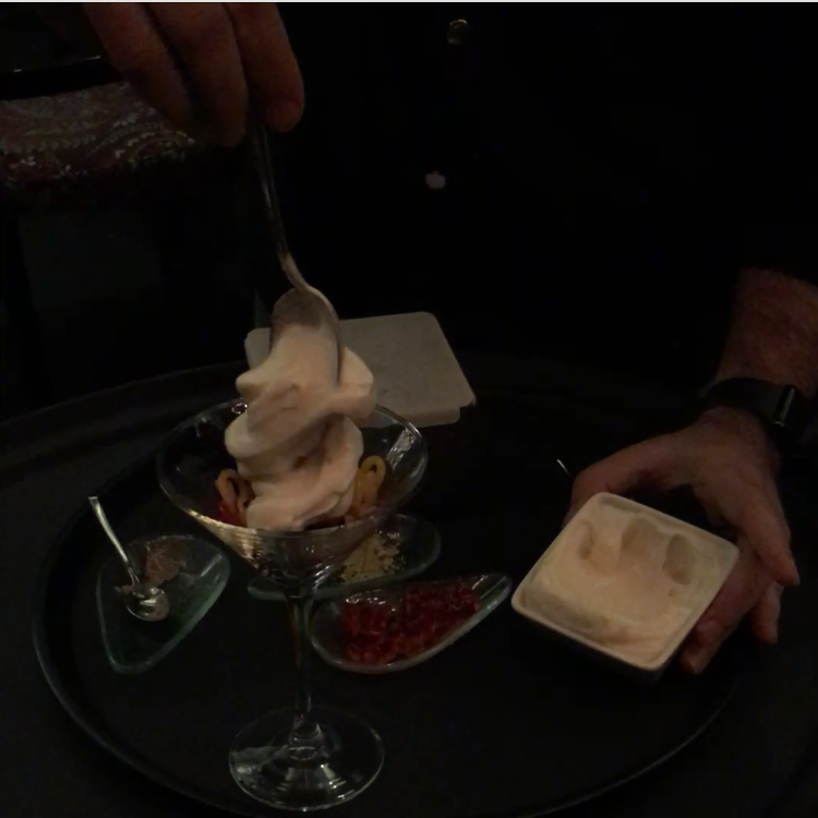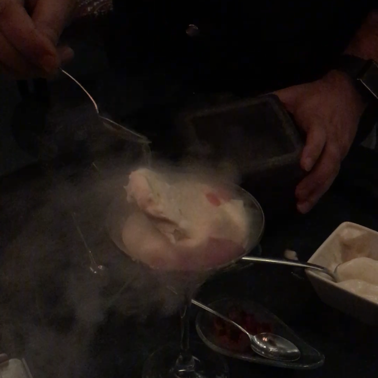 To start off with, the falooda is made from fresh fruit puree of raspberry, blueberry and mango, giving it that vibrant color. Chia seeds go in next. Then comes the beautifully done lightweight rabri foam that retains its wonderfully sweet flavor without adding the guilt. This is followed by roohafza jelly cubes for that color pop. A scoop of rabri foam is fried in liquid nitrogen which gives it a meringue-like texture, and it is placed on top of the falooda for a biscuit-esque look. Then we see some more molecular action with freezing liquid nitrogen right off its box onto the falooda, adding a smokey effect that’s such a craze of the phase and giving this dessert a cool touch. Finally it is garnished with pistachios and served! I simply lived Kunal’s handiwork. Definitely going back for more of this.
