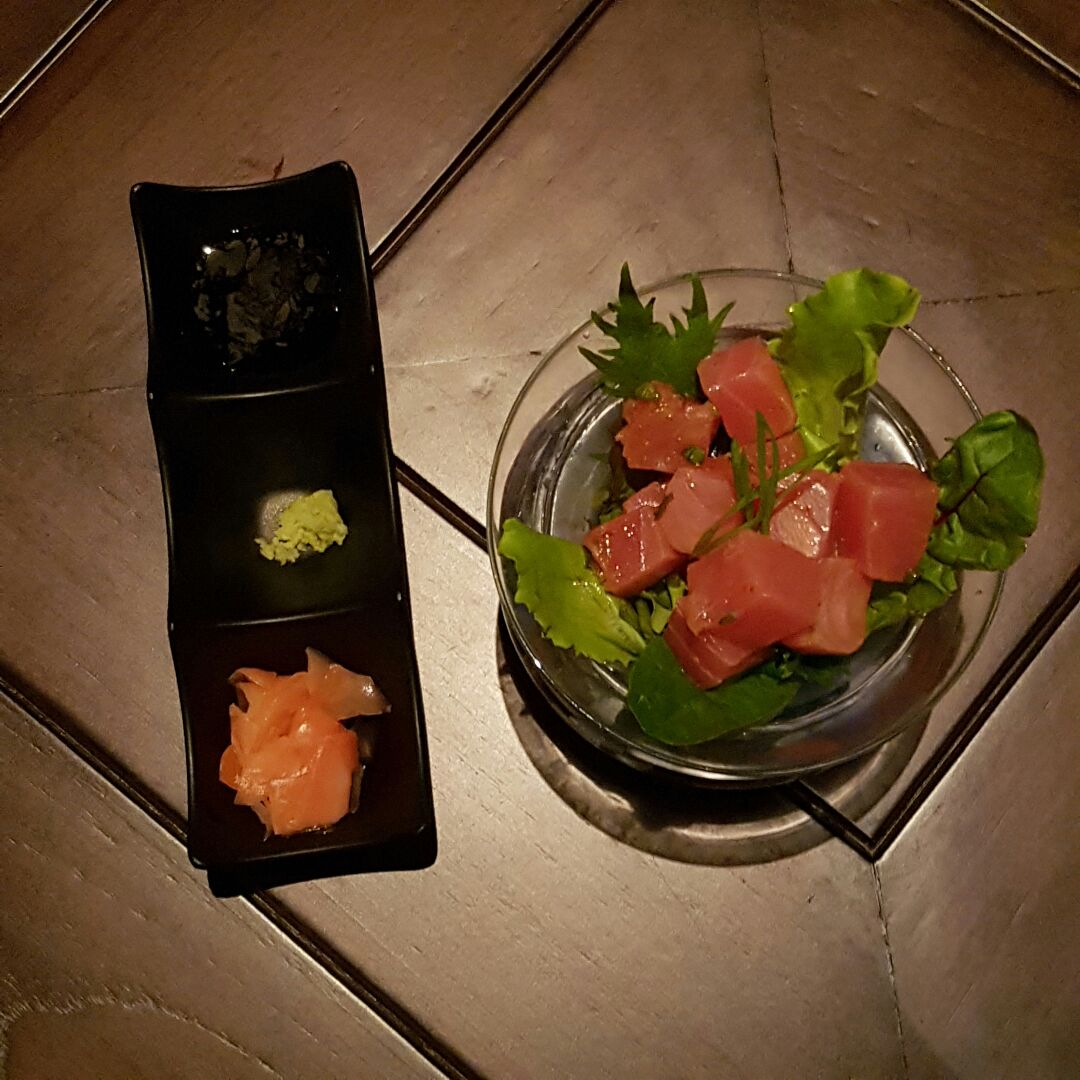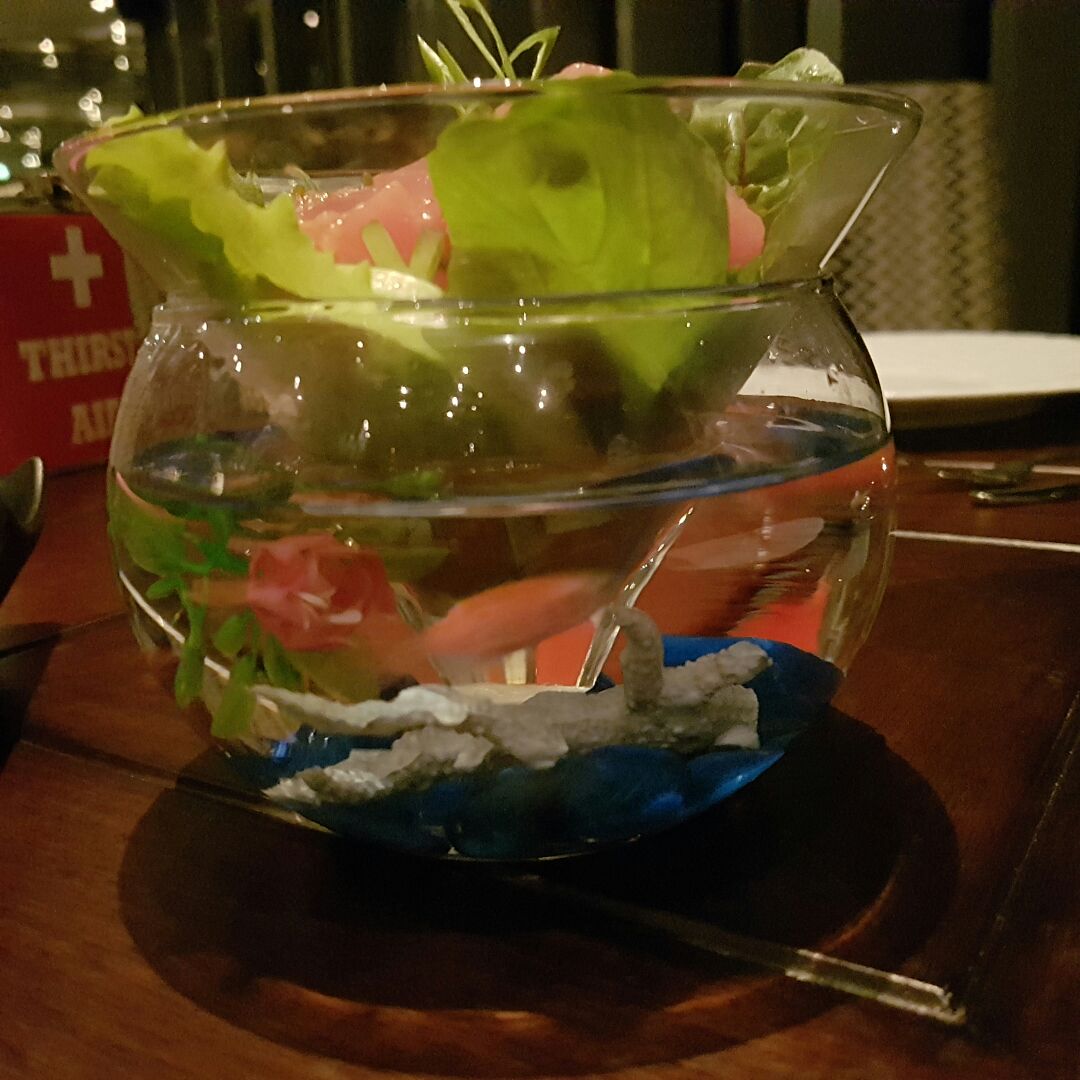 Life of Nemo! An exciting name and an even more exciting presentation. This butso styled kuromaguro blue fin tuna, spiced with Japanese dashi condiments is presrented over a fish bowl with live nemo fishes swimming in it. This crudos dish at Jaan at the Penthouse takes the concept of live action up a notch. The tuna fish was extremely tender. Since this is a raw offering, it was not really up my alley, but for raw food lovers, Life of Nemo would definitely be a delight.