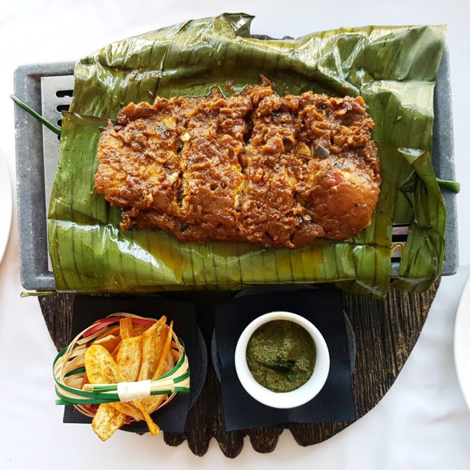 The Sea Bass Patrapoda, as the name suggests, is cooked in a patra or leaf. Inspired from ingredients of South India, the fish is laced in a tomato and onion gravy, the flavors of which seep through the tenderness of the sea bass and infuse it with its piquancy. This melt-in-your-mouth fish is served along with creamy curry leaf chutney and crunchy dehydrated banana chips.