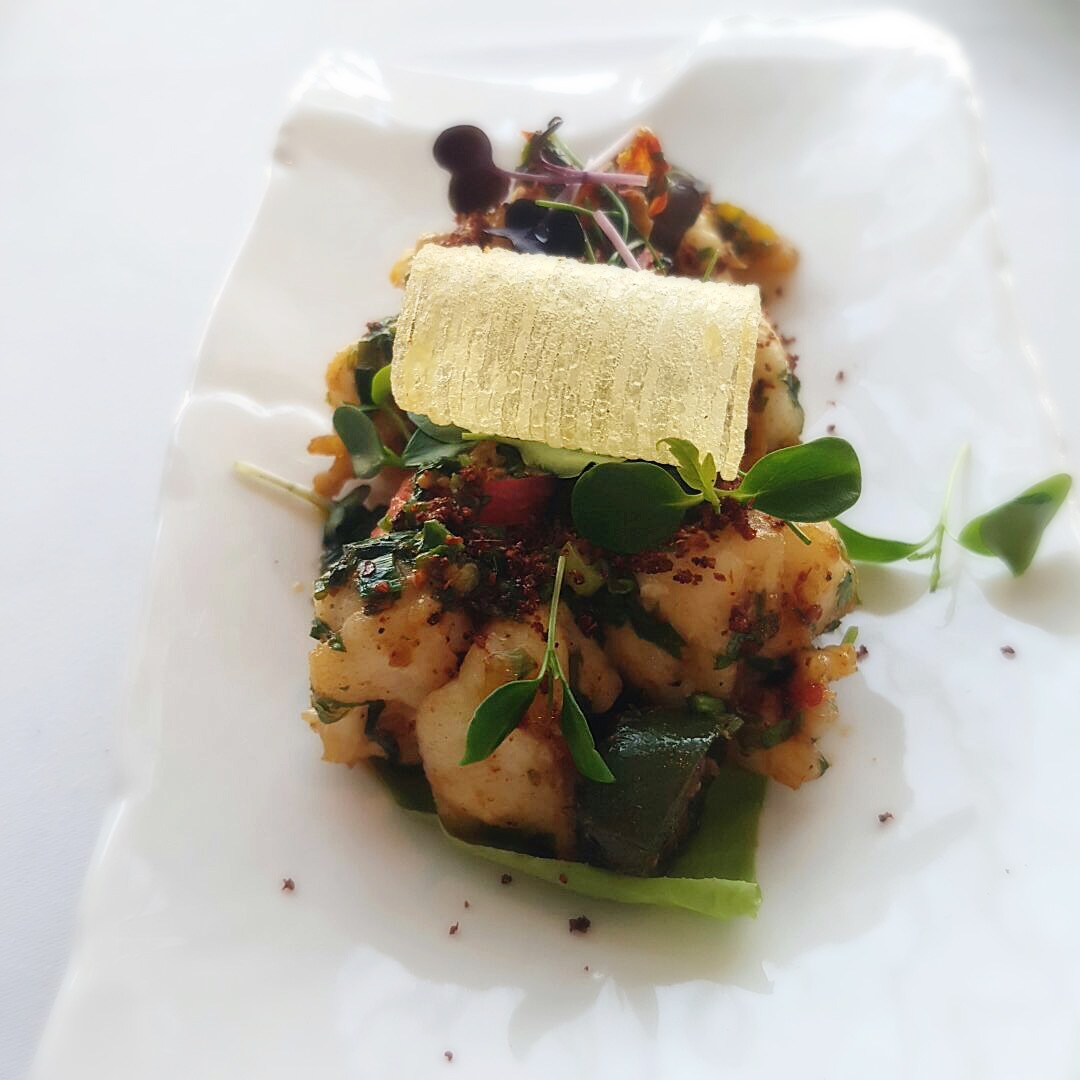 Their dexterity is apparent in desserts like this Ghewar Mille Feuille. Topped with and layering pistachio mousse alternated with raspberries, this Rajasthani meets French pastry styled treat comes with a side scoop of rose sorbet.