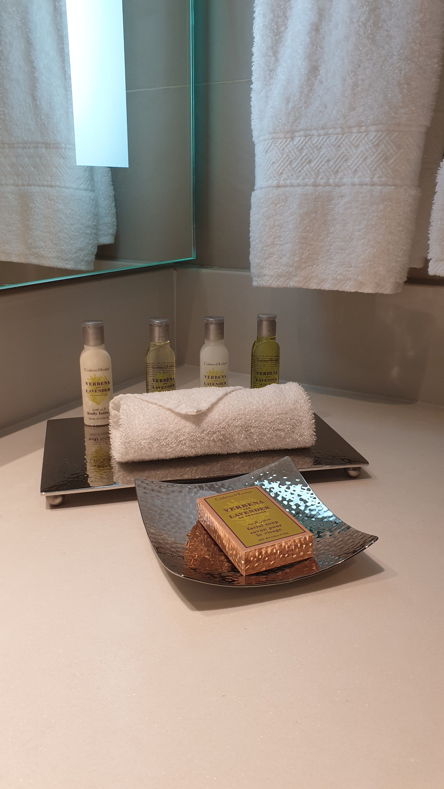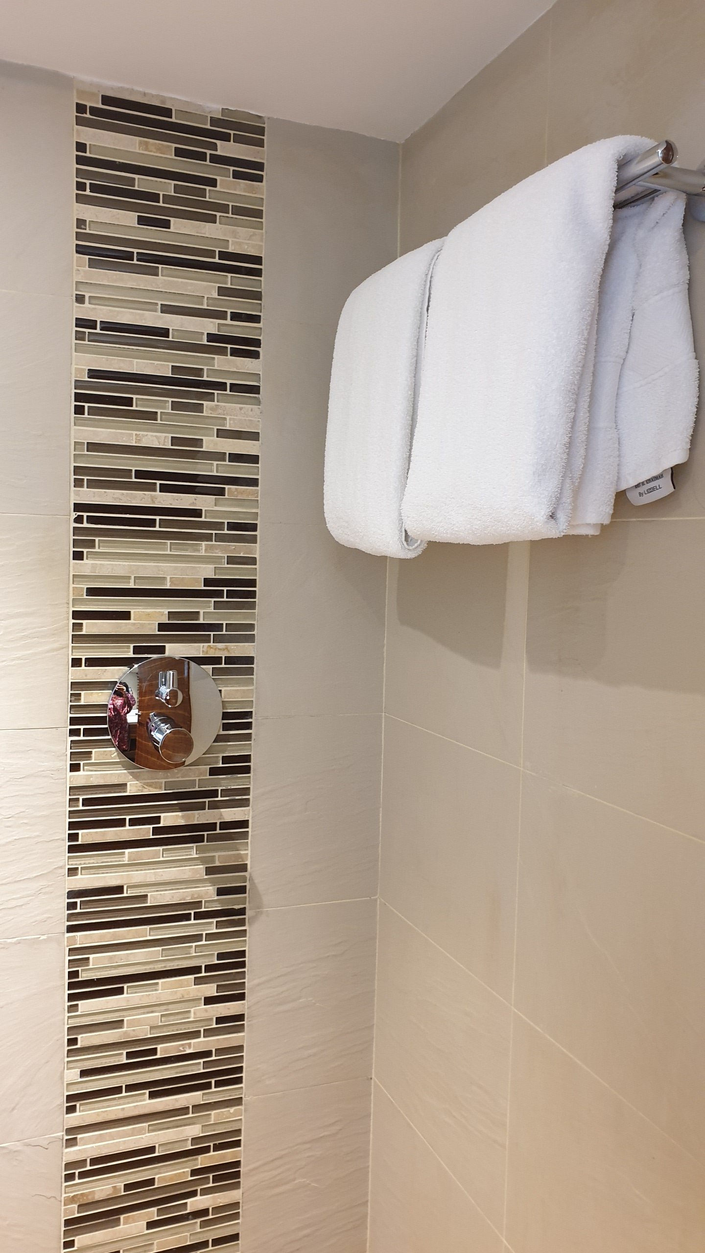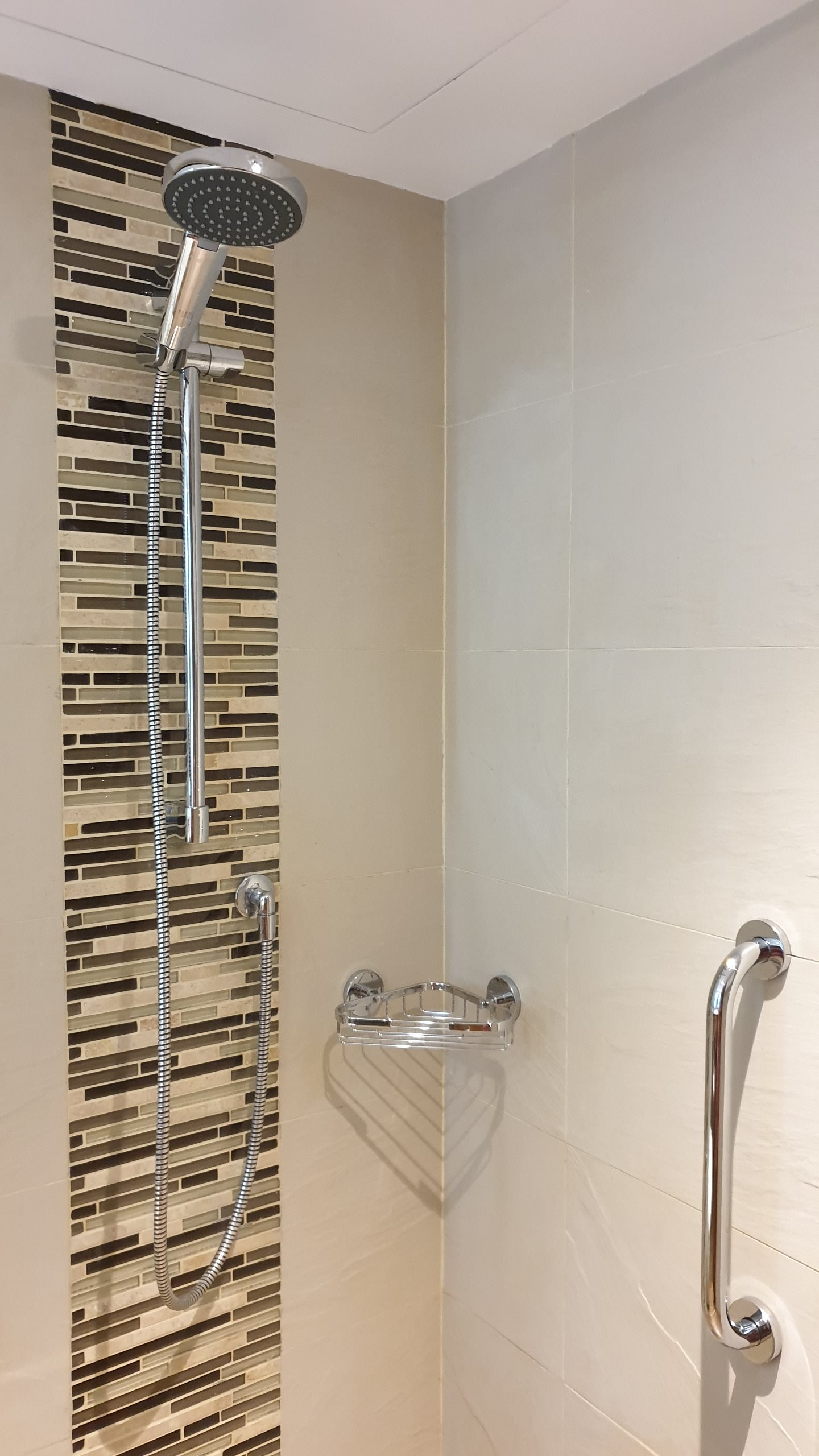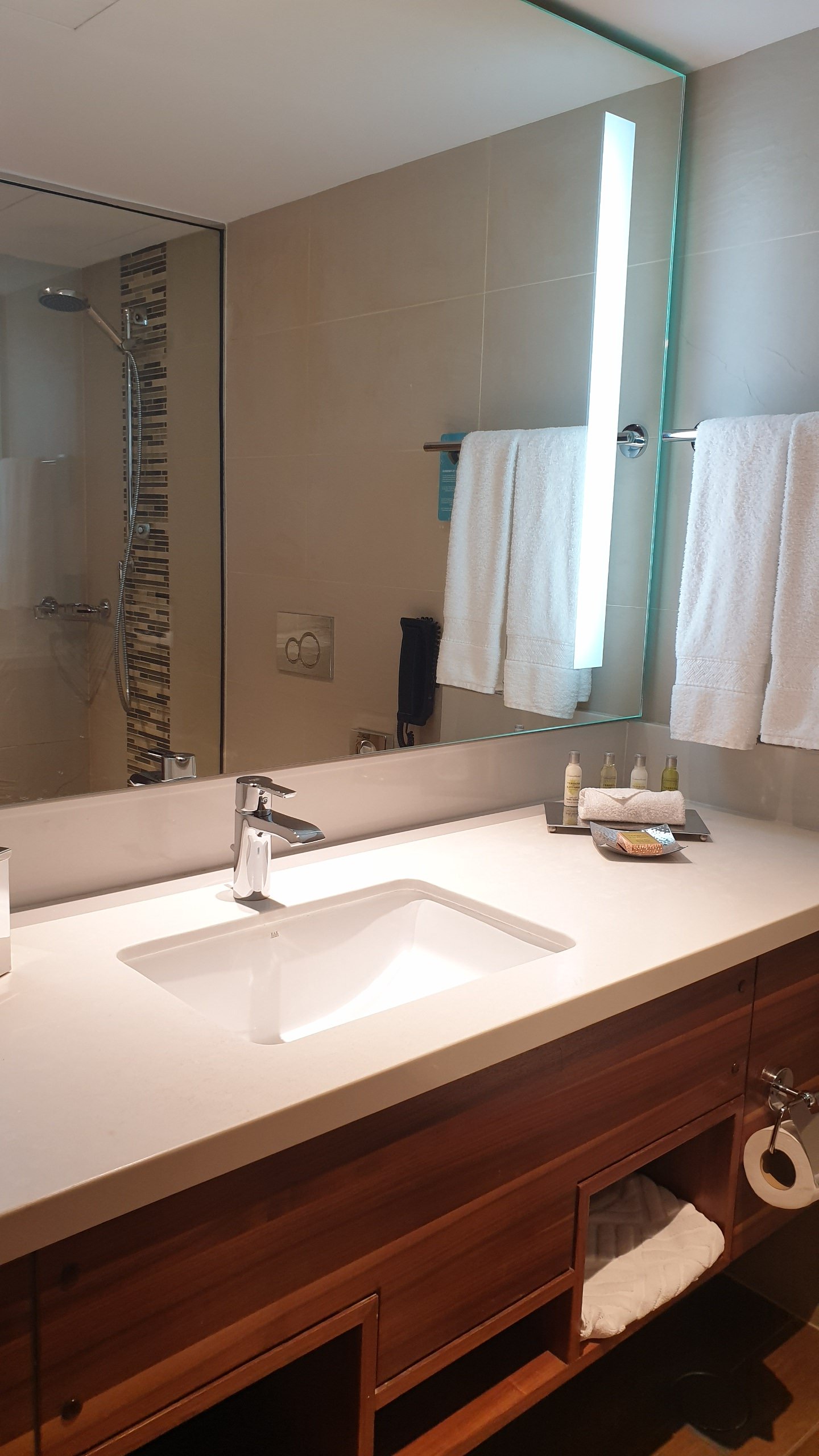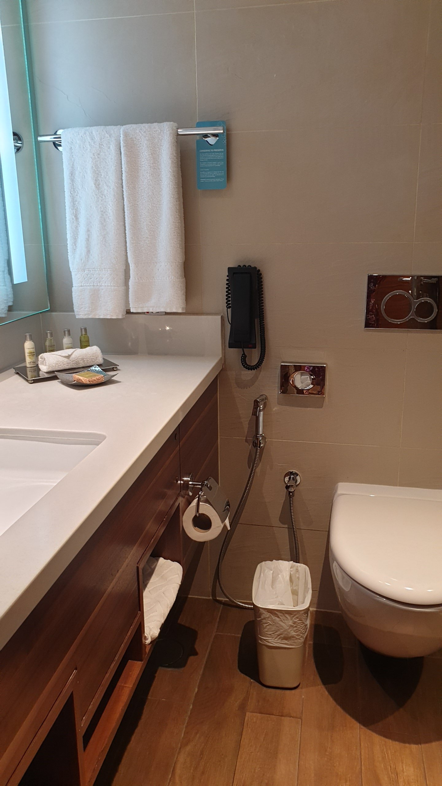 While the bathroom was super convenient, the one thing it missed was a bath tub. I am not a big fan of having tubs at home, but when it comes to hotels, I certainly fancy a soak or two. This being a 3 night stay, I would’ve certainly preferred some me time with a bubble bath and a glass of grape, but well, I had to settle for my tiny space in the pool. The bath was neatly arranged with a WC (and a shattaf!), a wash basin with an end to end counter and a standing shower area. I’d have liked it if the shower area had a door, since that would’ve restricted any water flowing towards the other half of the bath, but we managed.