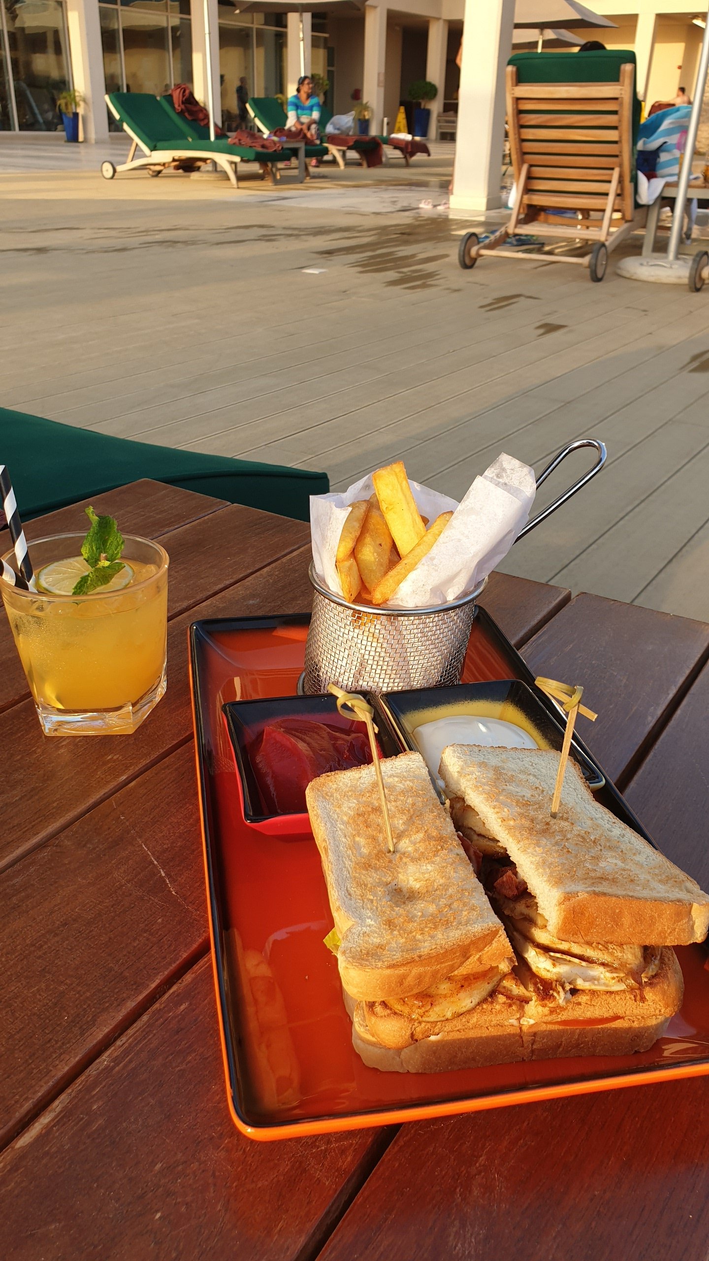 Our first instinct after settling in was to check out the pool, but then we didn’t want to face the blazing sun while it was right over our heads so we decided to nap a bit. I usually don’t like napping in hotels, unless I am really tired, and this time around I wasn’t, so we ended up watching TV instead and before we knew it, it was time to check out the pool. The pool was crowded. And I mean it. Super crowded. It was as though the entire hotel was in that pool. We managed to spot a couple empty loungers and stacked up our towels there so we had some place to sit and sip our cocktails. Have I not told you how much I love sipping on cocktails by the pool! Since we were starving, and the complimentary peanuts wouldn’t suffice our hungry tummies, we also ordered a sandwich to go with the drinks. Between the drinks and the food, we found a little space in the pool to just let loose and feel the blues. One thing, and probably the only thing I love about summers, is that I can walk out of the pool without any shivering at all. And that feeling is priceless.