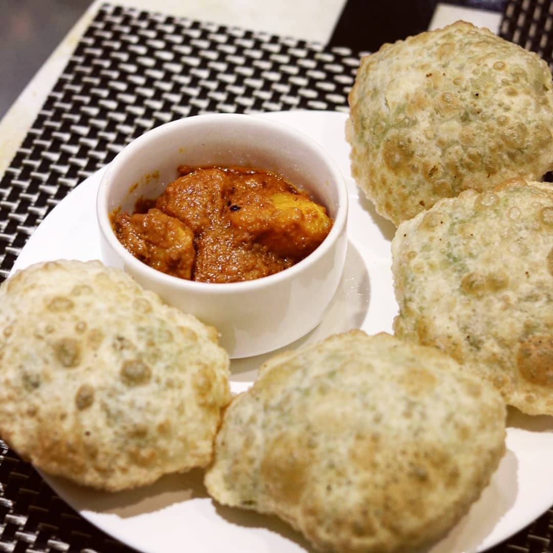 We almost expect to move to the main course next, but instead we’re offered a snack course, which is quite a regular thing for Bengalis. My favorite dish from the evening, this one is a Matarshuti Kochuri and Alu Dum that features a small portion of potato curry with peas puri. The curry is simply brilliant, and we love the gravy that coats the chunky yet tender spuds. And it honestly couldn’t have found a better match that those puris stuffed with peas. The light green hue on the puris is such a pleasant sight!