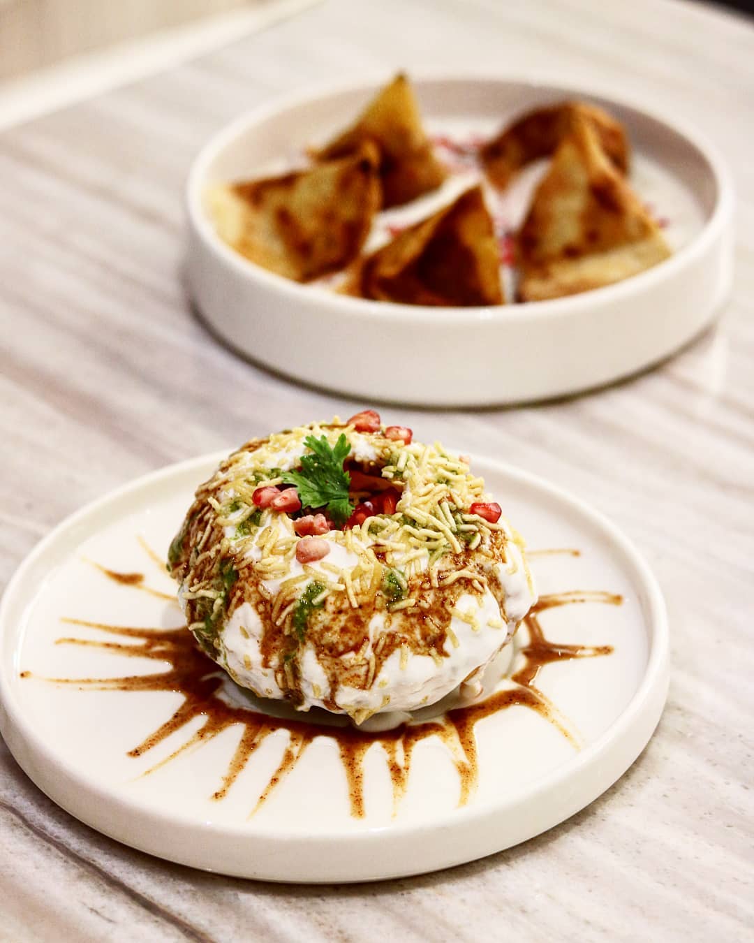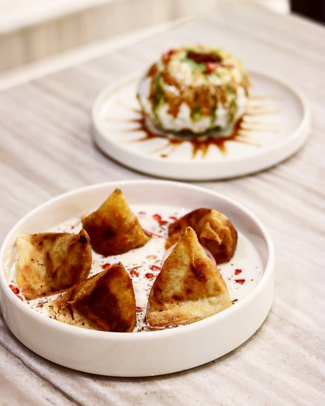 Among starters and salads, we begin with the highly recommended Dill Kashmiri. My Indian palate instantly recognizes its chaat nature. Dressed up as a giant puri stuffed with cold yogurt, mashed potatoes and sprouts, and enhanced with spices, sev and pomegranate seeds on top, this makes for the perfect cold starter. Our obsession for Emirati Indian continues with mini Prawn Samosas. Filled with an utterly creamy prawns ragout, these crispy triangles are served on a bed of rich labneh yogurt, accented with pomegranate seeds and sumac spices.
