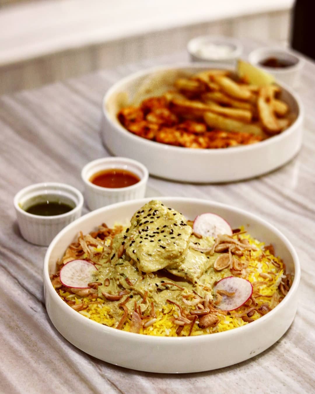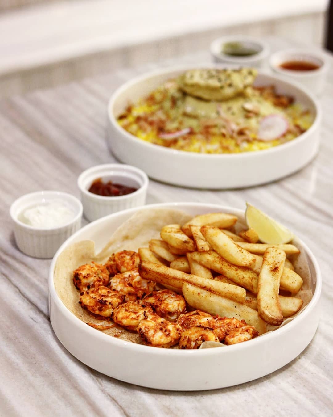 We then move on to a couple of grilled dishes and the first one is the Emirati Deyay Shiwa. Brilliantly executed to create a crunchy outer texture with an absolutely tender inside, these chicken skewers are marinated in yogurt and garlic that give it a juicy taste, then grilled over charcoal for that burnt look and coated with chili flavored cups which is a regional favorite. We love dipping it in the side hummus and following every bite of the chicken with those thin crispy fries. Next comes the Prawns Shiwa / Harr. As soon as I bite into the first piece of prawn, I tell myself, I might have just found the best prawns in Dubai! Marinated in a spicy mix with garlic, lemon and yogurt, these shrimps and super juicy, hot and tender like cotton. Every piece oushes you to tey the next one, and honestly, it’s quite a difficult task to share this dish. The steak cut fries make a nice side carb, while the garlic sauce and ketchup are great for dipping.