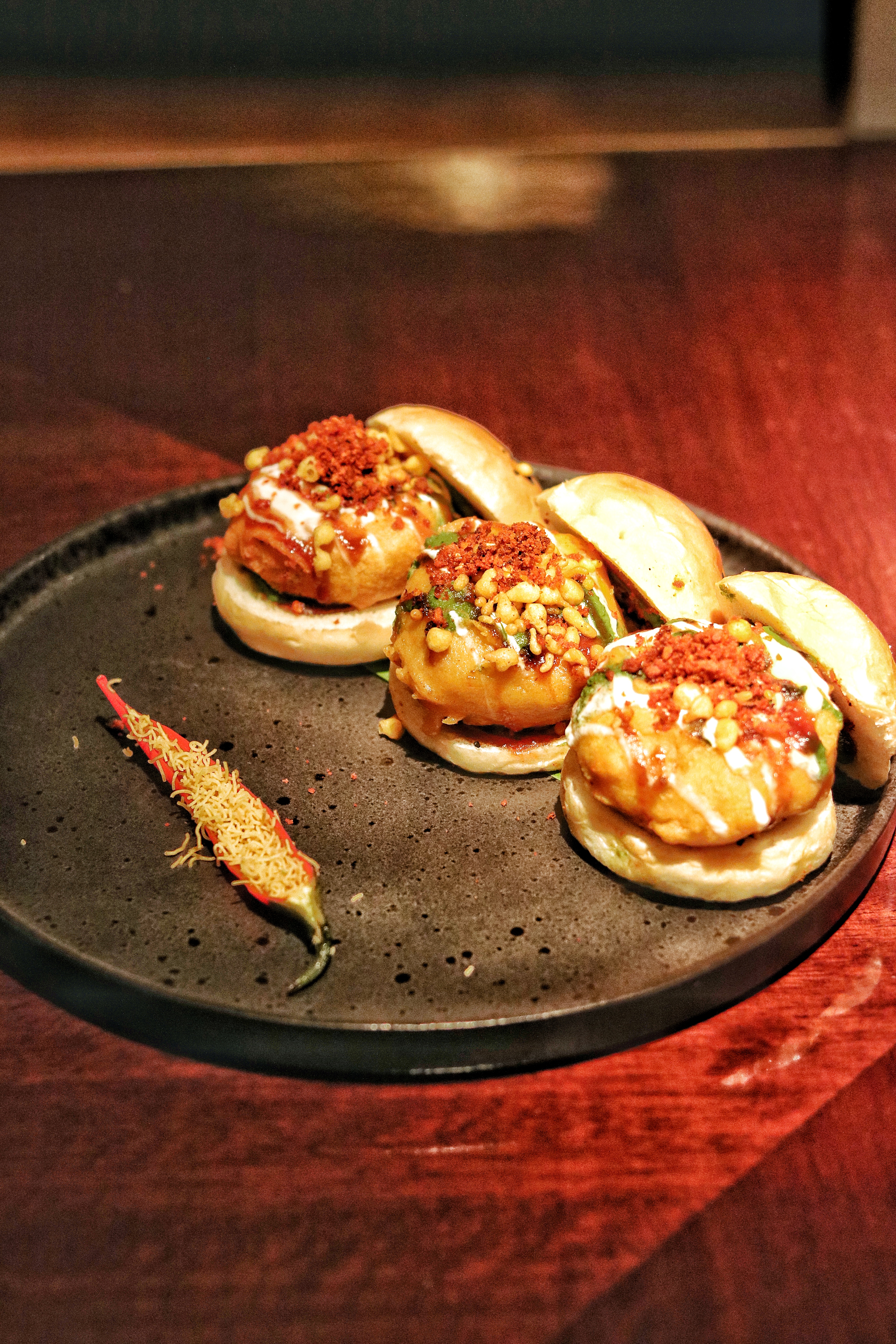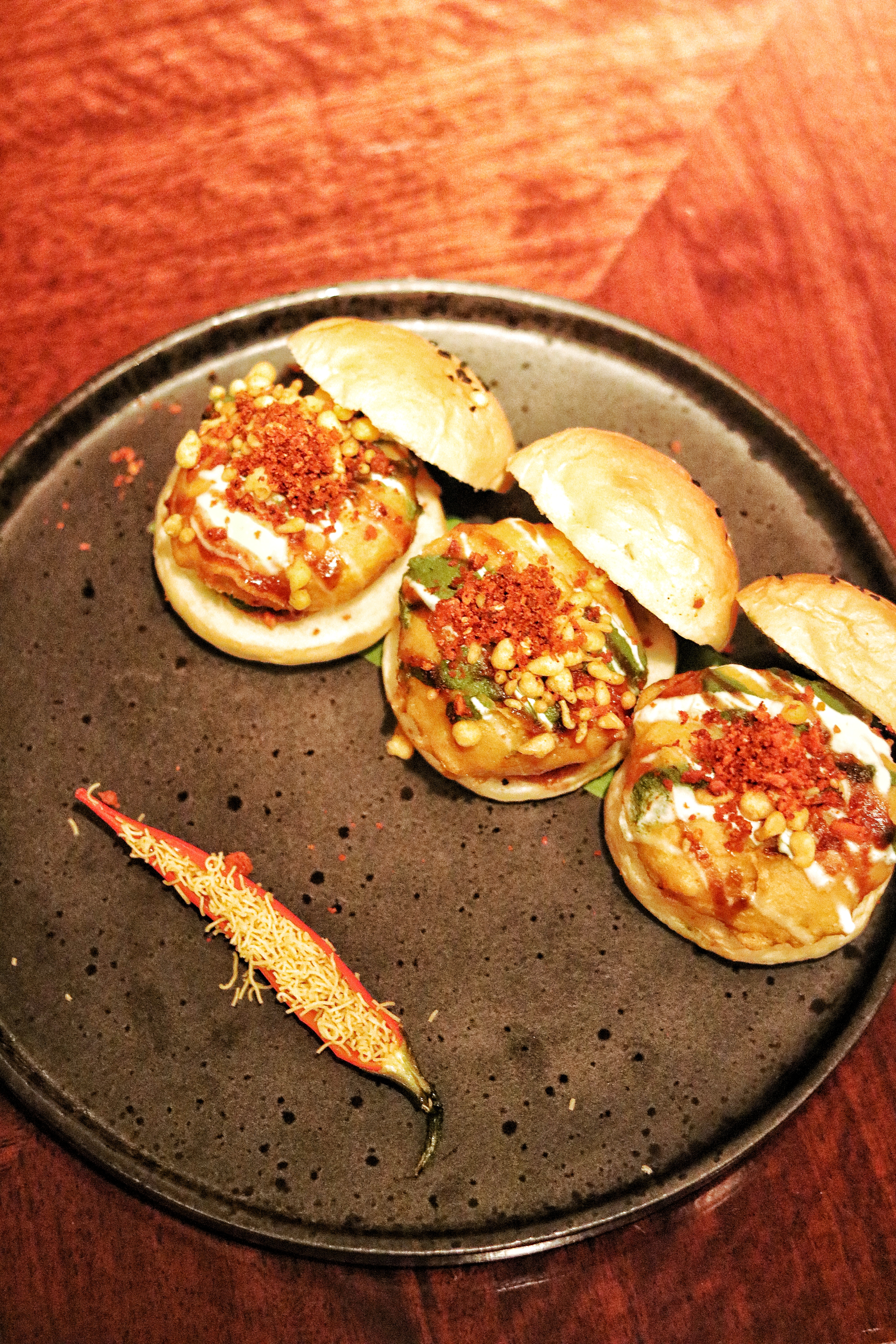 Nothing says Aamchi Mumbai like a vada pav, and this marks the beginning of our journey through the Mumbai variety. An identity in itself and the face of street food in Mumbai, the Vada Pav Slider (AED 25) at Asha’s is inspired from the famous Ashok restaurant. It comes in a portion of 3 sliders and the ingredients are heavy enough to fill us up quick. Made quite the classic way with potato vadas topped with tangy sweet spicy chutney and sandwiched inside a bun, these ones come with the addition of boondi. While the guys at Ashok sell over 3,000 vada pavs in a day, I find the ones at Asha’s slightly sweet for my palate, possibly made so to suit the audience.