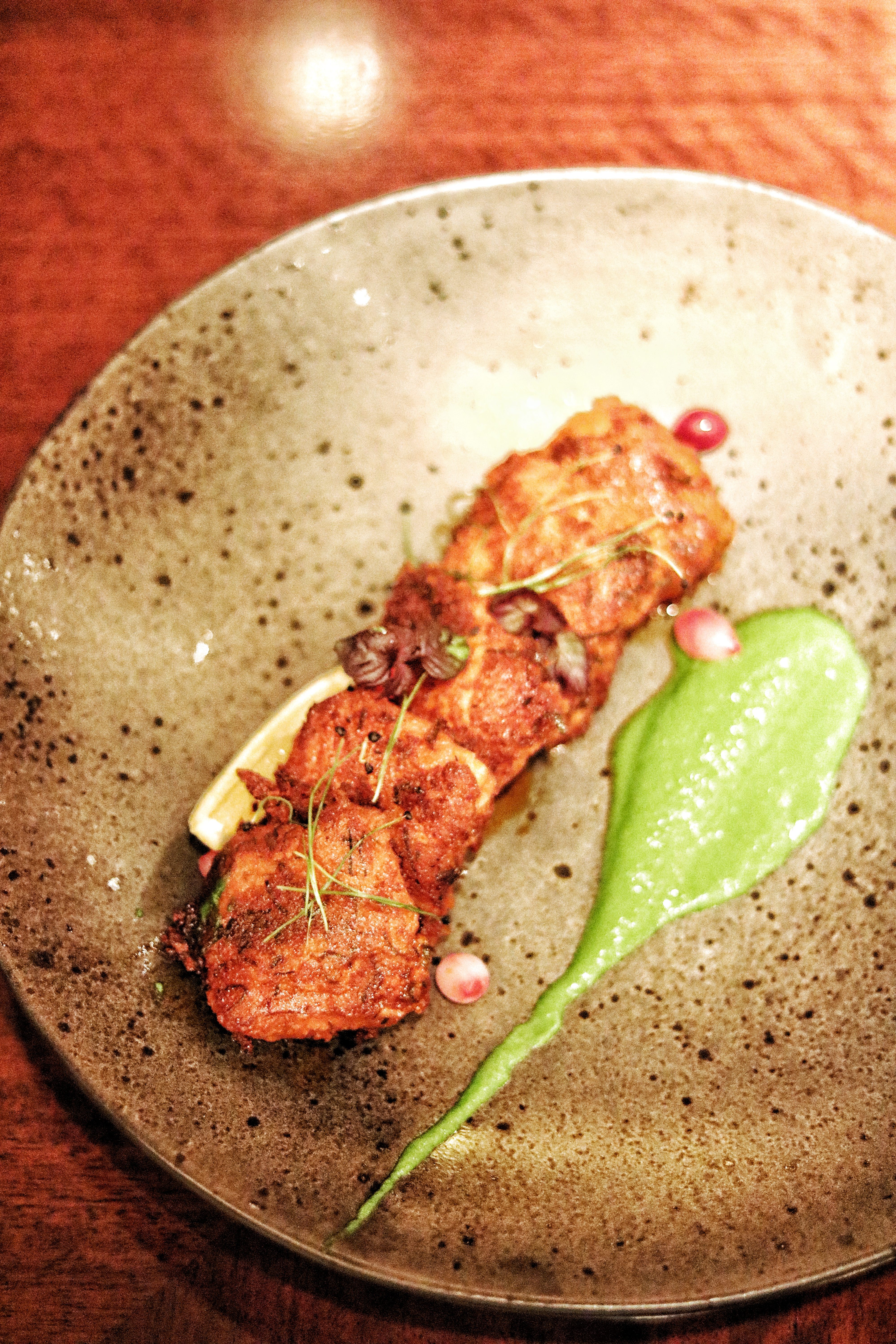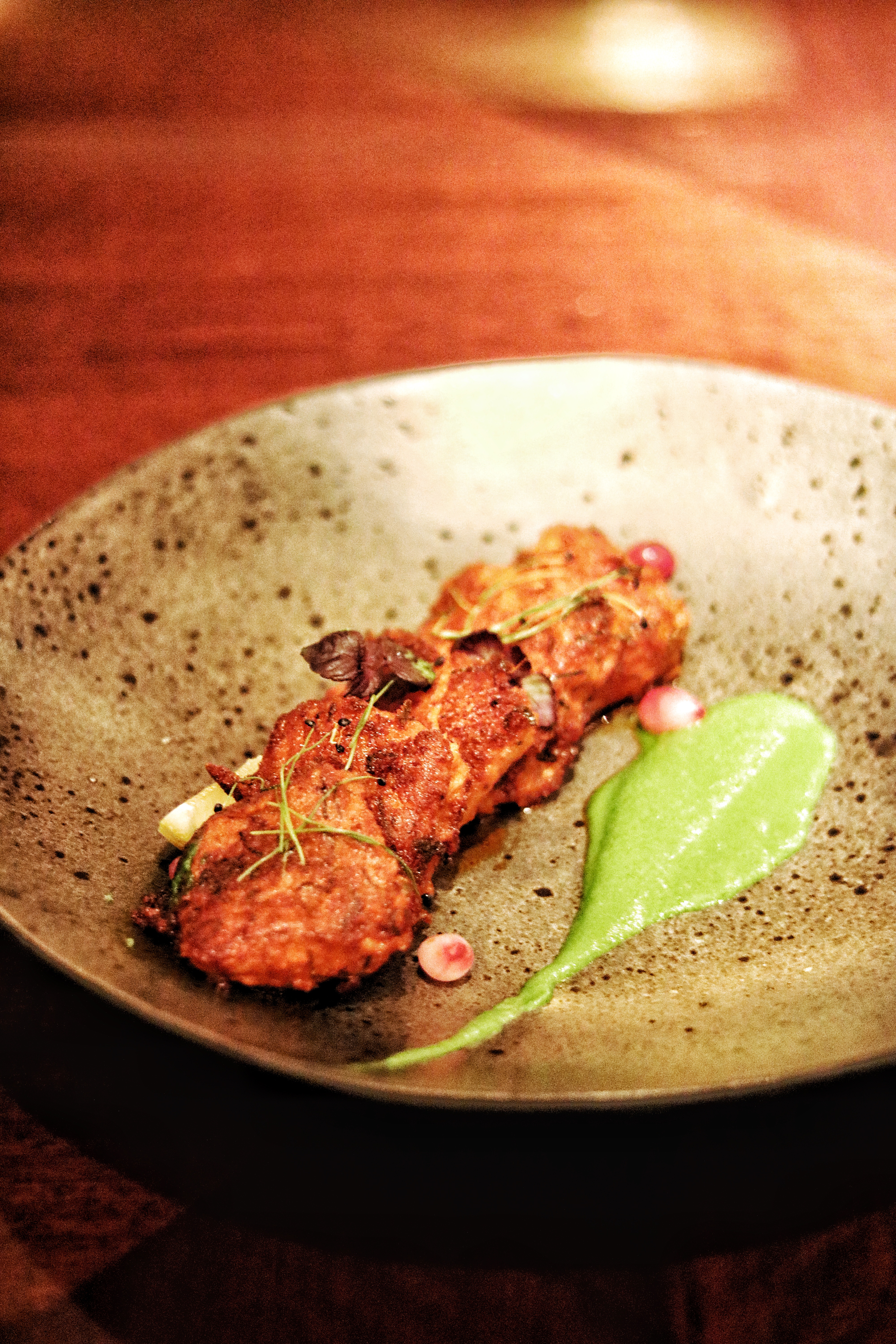 After a veggie start, it is time for us to dive right in with their seafood starters. Paying an ode to the Koli (fishermen) of Mumbai, the recipe of Koliwada Prawns (AED 55) is picked after the chefs’ visit to one of the oldest fishing villages – also known as Koliwada – in Mumbai. My favorite, these prawns have a crunchy batter fried outer dusted in Kashmiri red chili powder, and are served along with a contrasting chili mango salsa. Another must visit ticked off their list is the famous Mahesh Lunch Home. Specializing in delicious yet simple seafood, dining at this restaurant has encouraged the chefs to recreate Machli Tawa Masala Fry (AED 49). With a hearty portion of filleted pan grilled fish, doused in the most fragrant and flavorful Mumbai spices, this is one of those melt-in-your-mouth dishes for me.