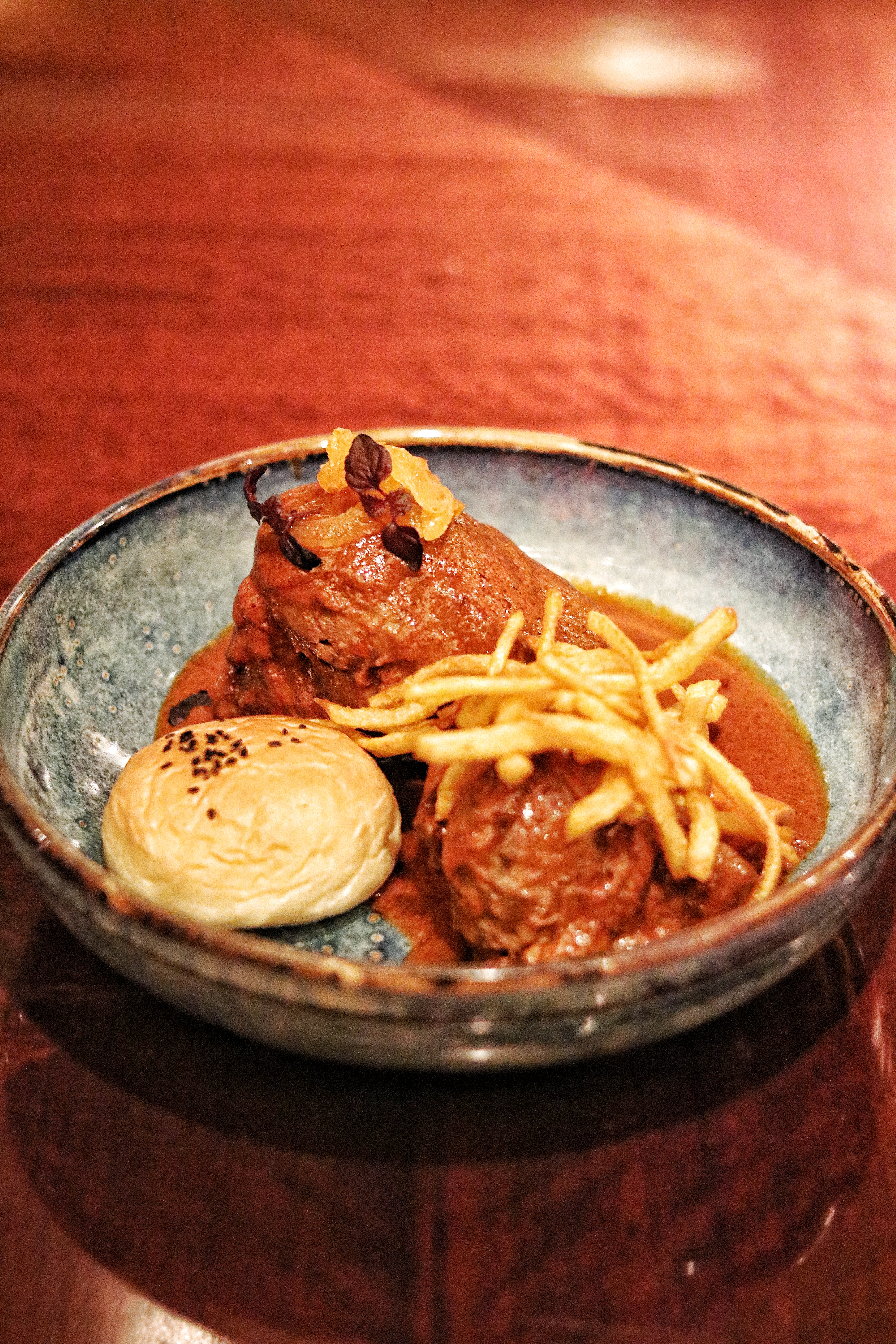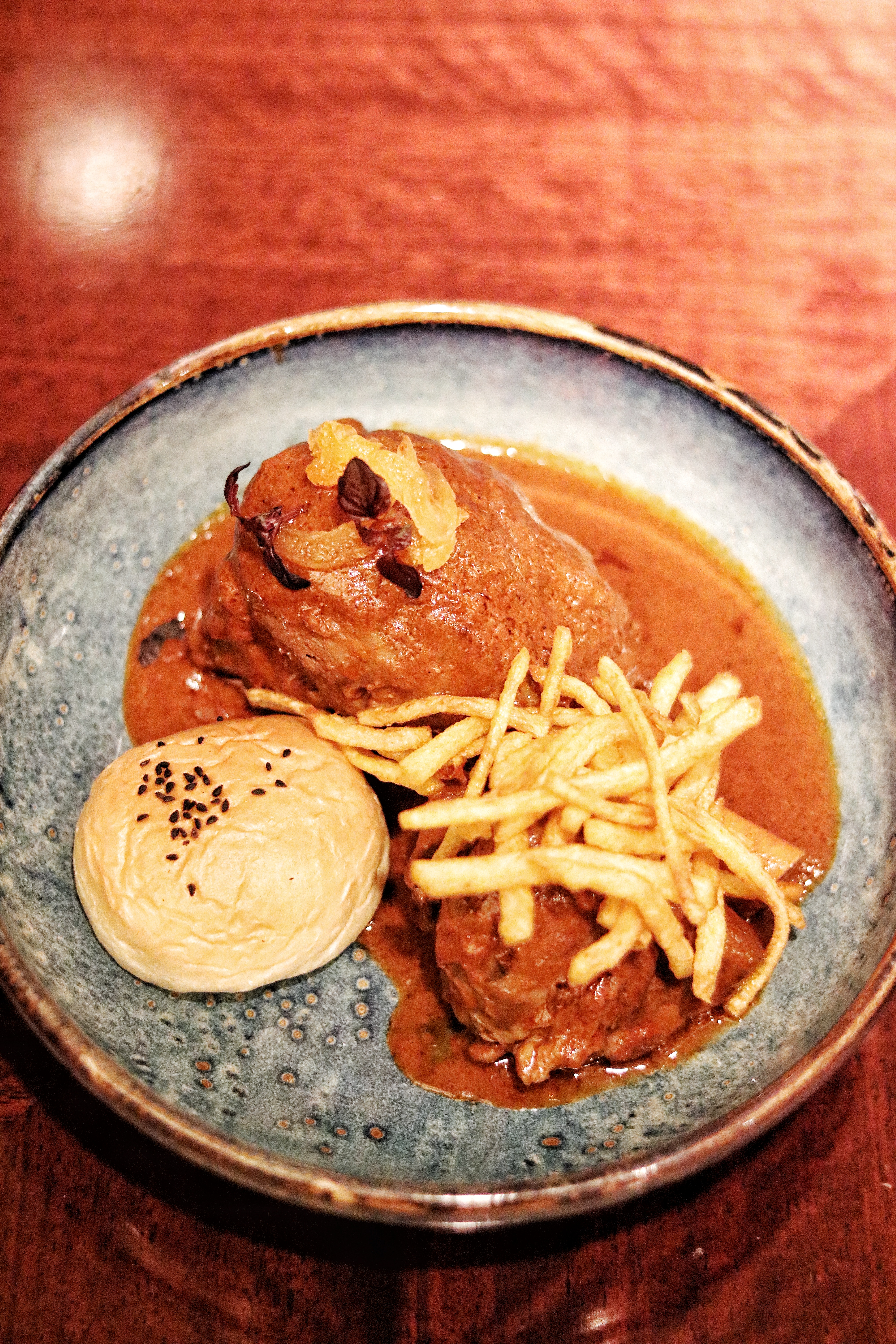 Next up comes my most cherished dish. Cherished, not because I have always loved it, but because I had no idea about its existence until I try it at Asha’s, and needless to say, it is love at first bite. Kombdi Vade (AED 65) at Asha’s is Chef Navin’s take on the Konkan styled kombdi (chicken) curry which features hints of coconut, onion and a regional Malvani variation of garam masala. The curry is a good balance between spicy and savory, and that chicken is unbelievably tender. The vade or deep fried puris made with rice flour and black dal, pair perfectly with the curry. This dish comes from the kitchens of Konkan Swad which is well known among the locals for Gomantak (Goan) cuisine, and the dish is apparently one of the chef’s favorites too! From the same restaurant comes another one of their loved dishes, this time played up by Chef Bobby. The famous Parsi Salli Boti (AED 75) features a hearty chunk of lamb shank that’s cooked in a rich apricot, jaggery and vinegar gravy. The salli or fried potato sticks garnish the lamb, and a fresh piece of bun is placed on the side to mop up the gravy. I find the dish to have more of an acquired taste, but a lot of people at our table love it.