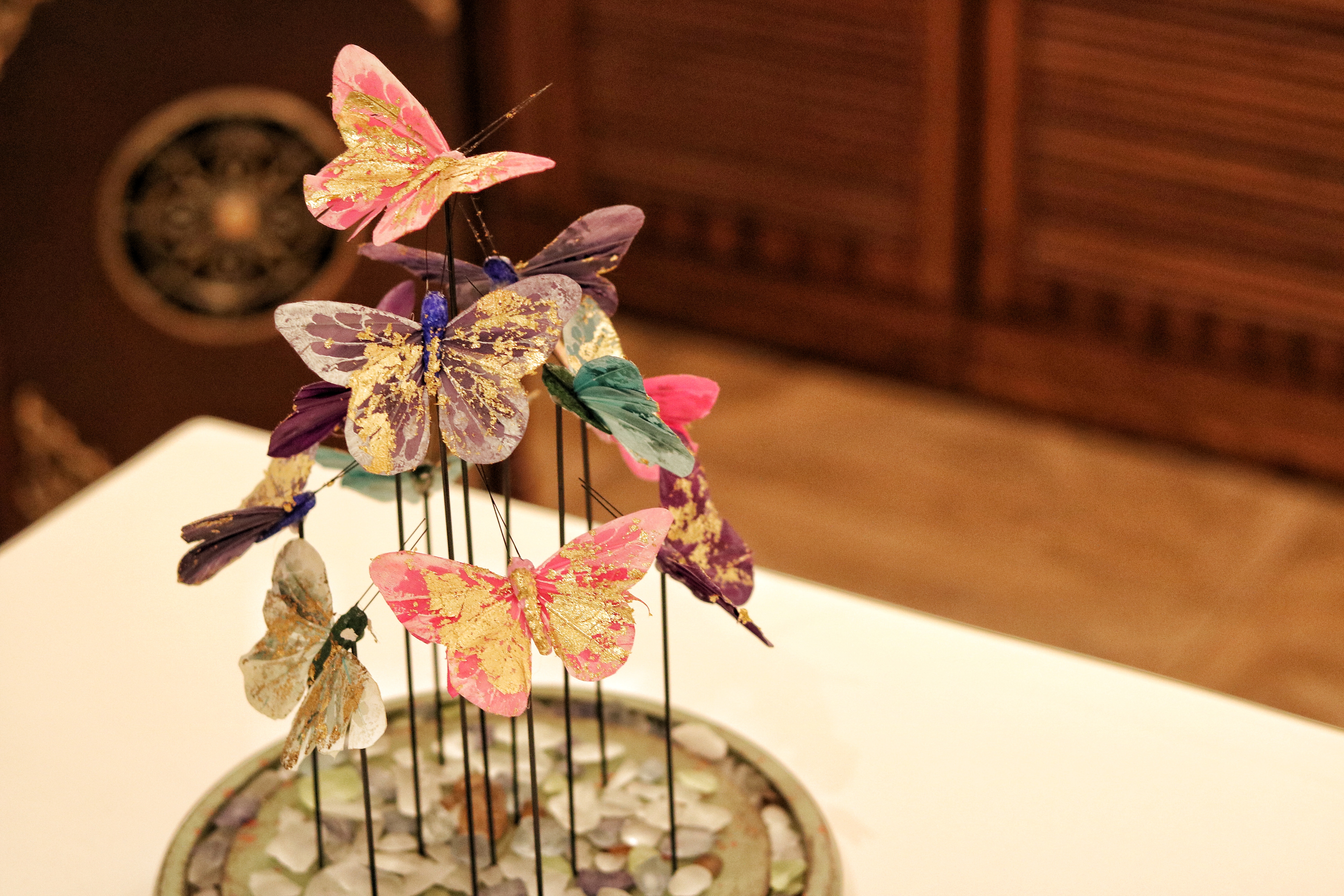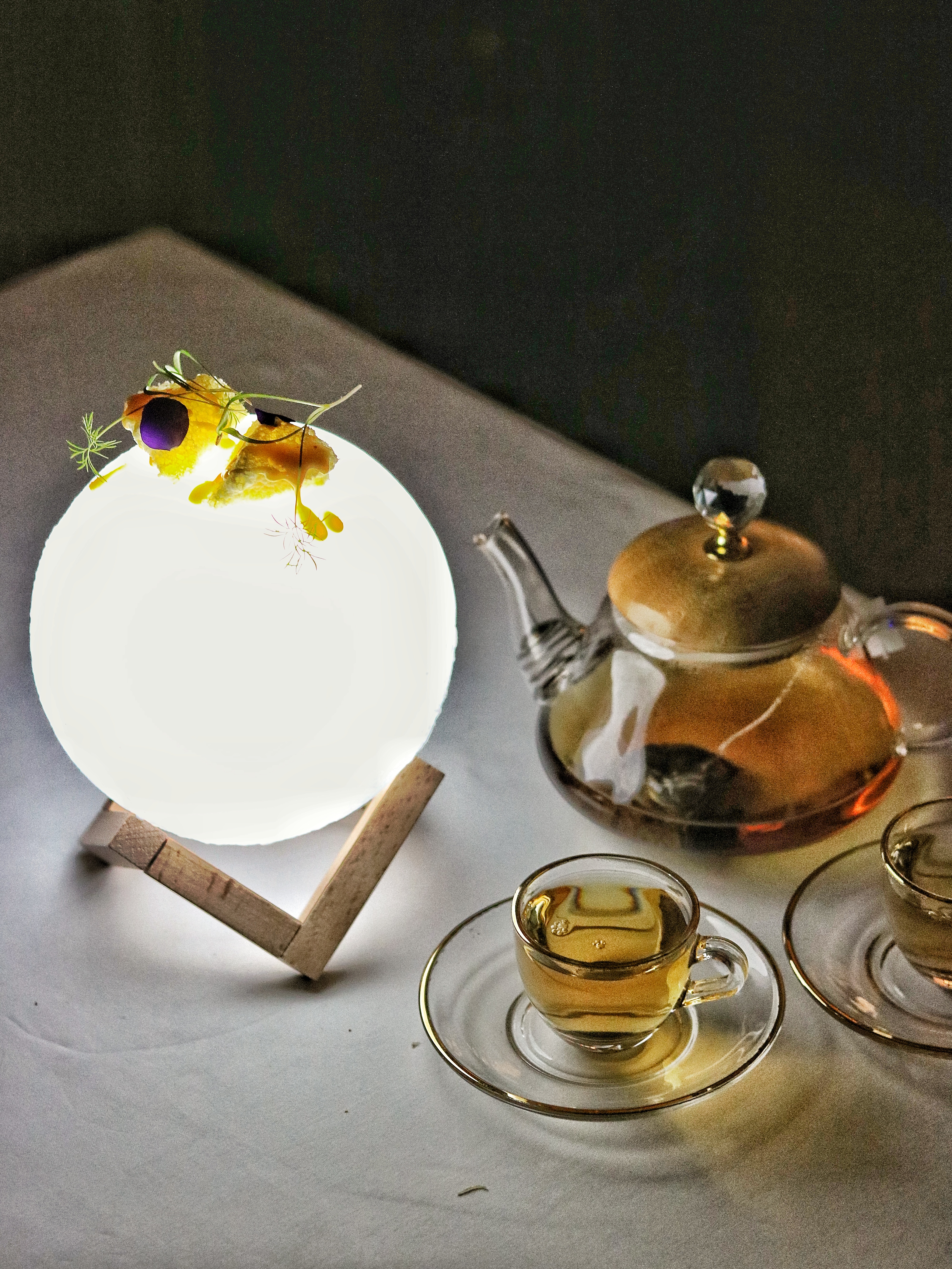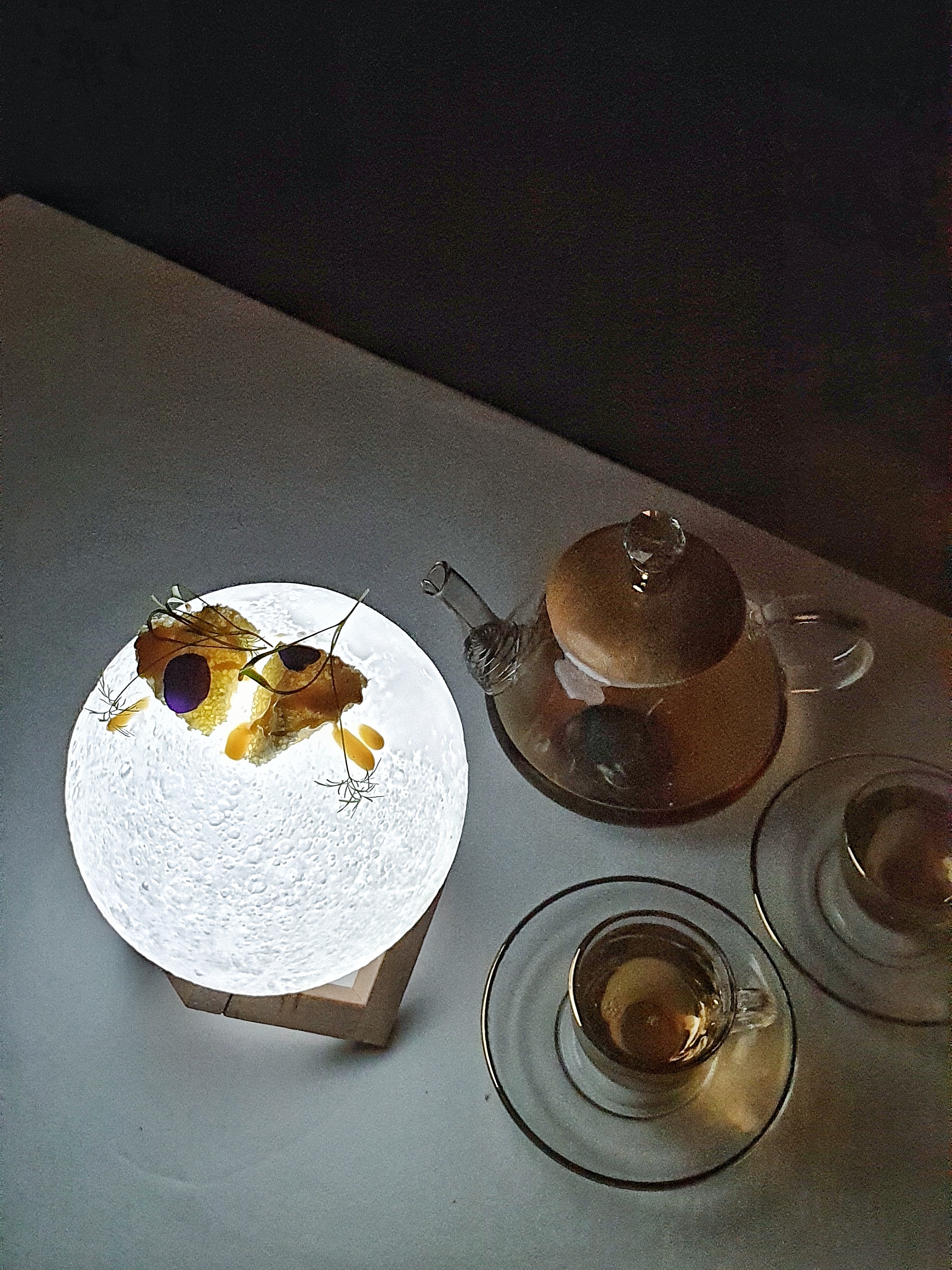 While we still recover from the bittersweet cacao, we see the servers brewing some tea. As they place the glass tea cups and kettles on our tables, the lights suddenly go off, and we are surprised to see a Honey Moon right in front of us. Himanshu steps over to fill in our tea cups while he explains the concept behind this striking finale. The moon-shaped ball of light is topped with an aerated chocolate bee hive doused in organic Sidr bee honey that is sourced from the mountains of Fujairah. Coupled with a cup of black tea, this duet certainly marks a smooth ending to our French classical journey.