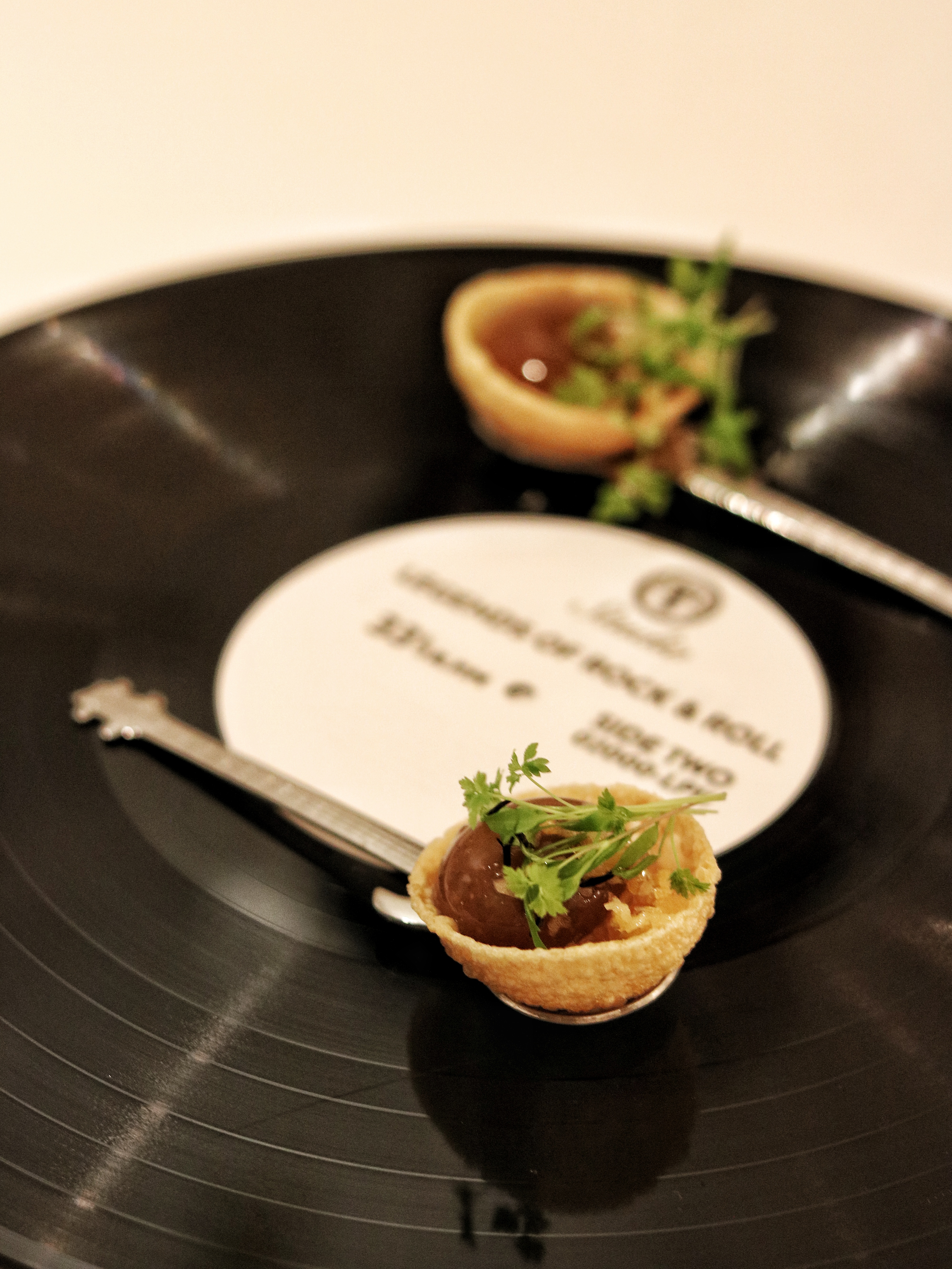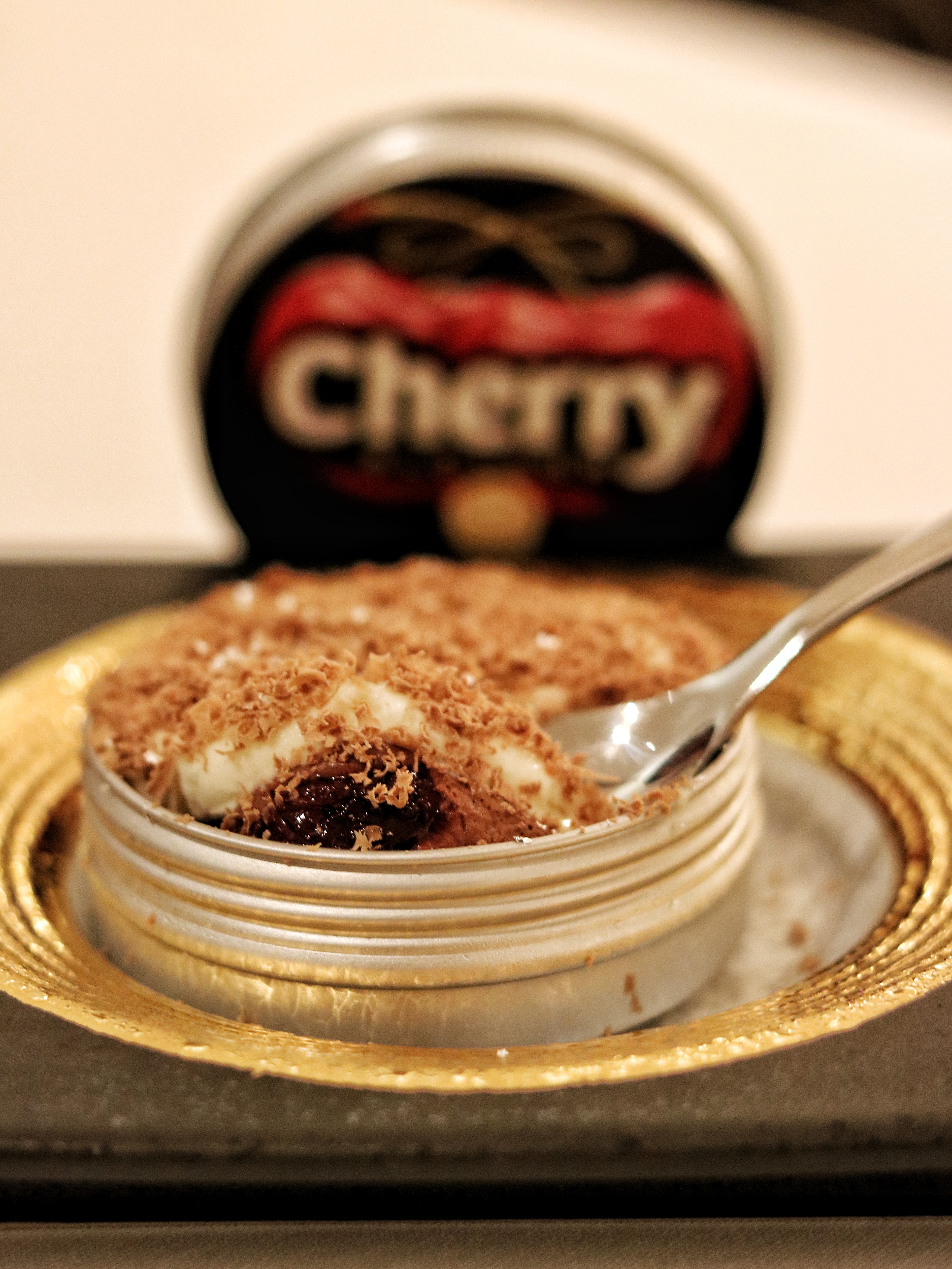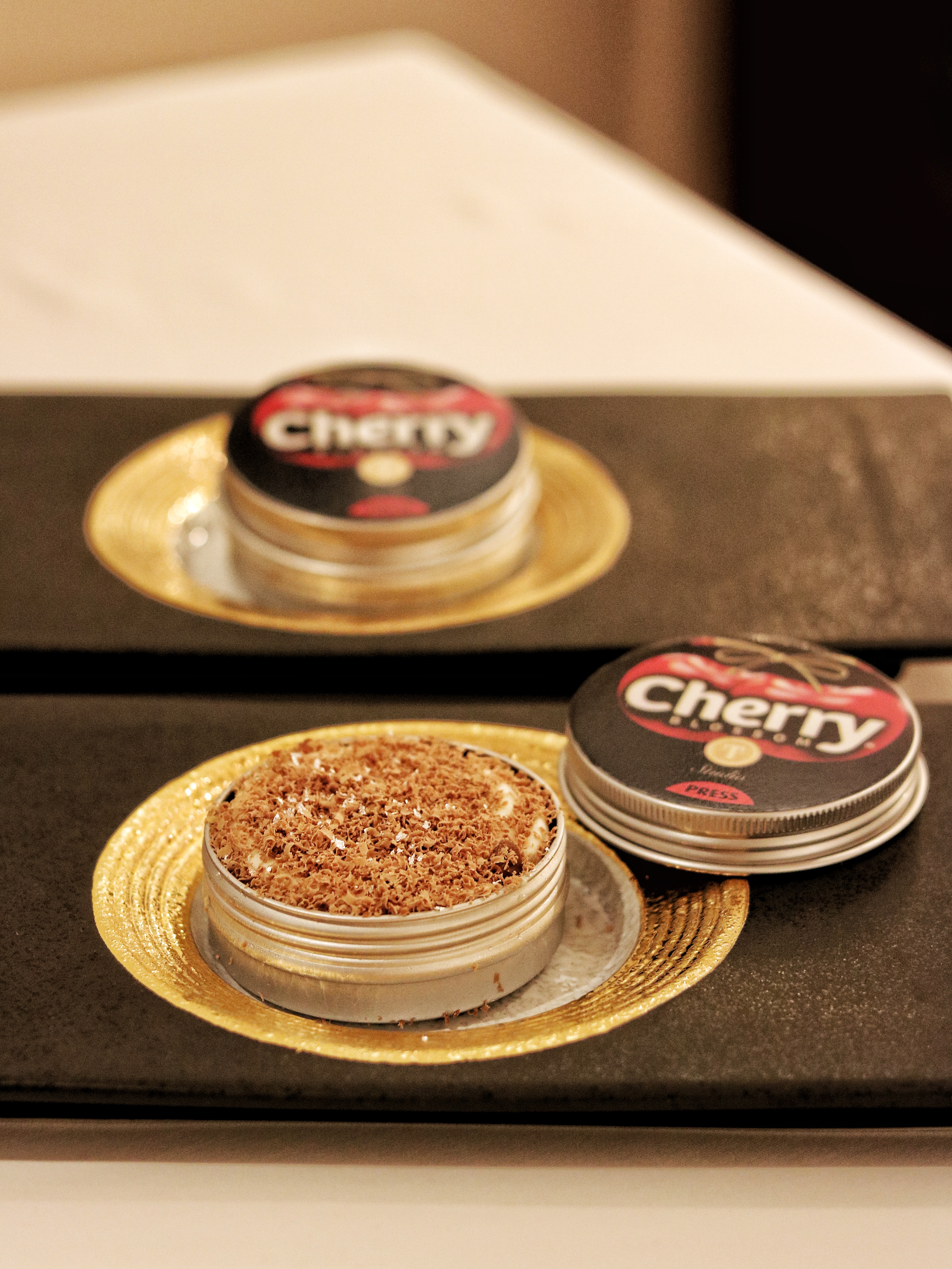 Next it’s time for the Savoury course of Payasam. A little more deconstructed in its presentation compared to last time, this sweet savory pre-dessert highlights the South Indian Sadhya meal, where the leftover poppadum is often mixed with payasam and eaten together. We are brought a plate with a banana leaf that is followed by individual layers of condensed milk, pineapple carpaccio, mango, an edible butterfly and of course, the poppadum. We are clearly instructed to not eat the banana leaf! The Entremets course brings a lot of nostalgia to the table, albeit in a very humble way. Titled cherry blossom, this dessert is served inside of a classic shoe polish tin of the same name. Don’t worry, there has never been any trace of shoe polish in the dish, but what it packs inside is a lovely cake layered with homemade cherry compote and ice cream, making it the ideal comfort dessert. While I’m busy licking the tin clean, Himanshu mentions how it was his original plan to serve this with a shoe brush on the side (obviously a brand new, unused one), but was a little skeptical it could turn out to be offensive for some.