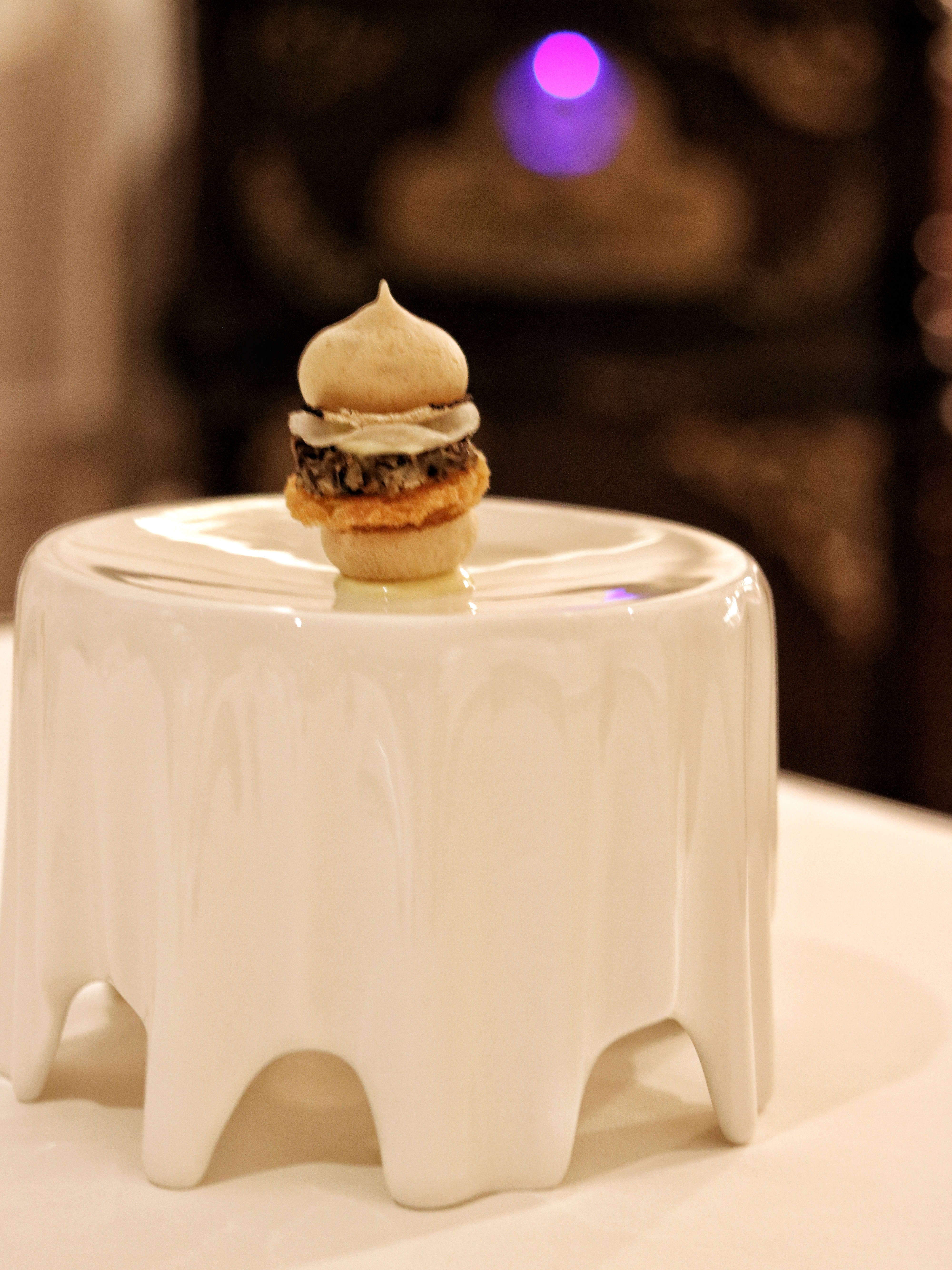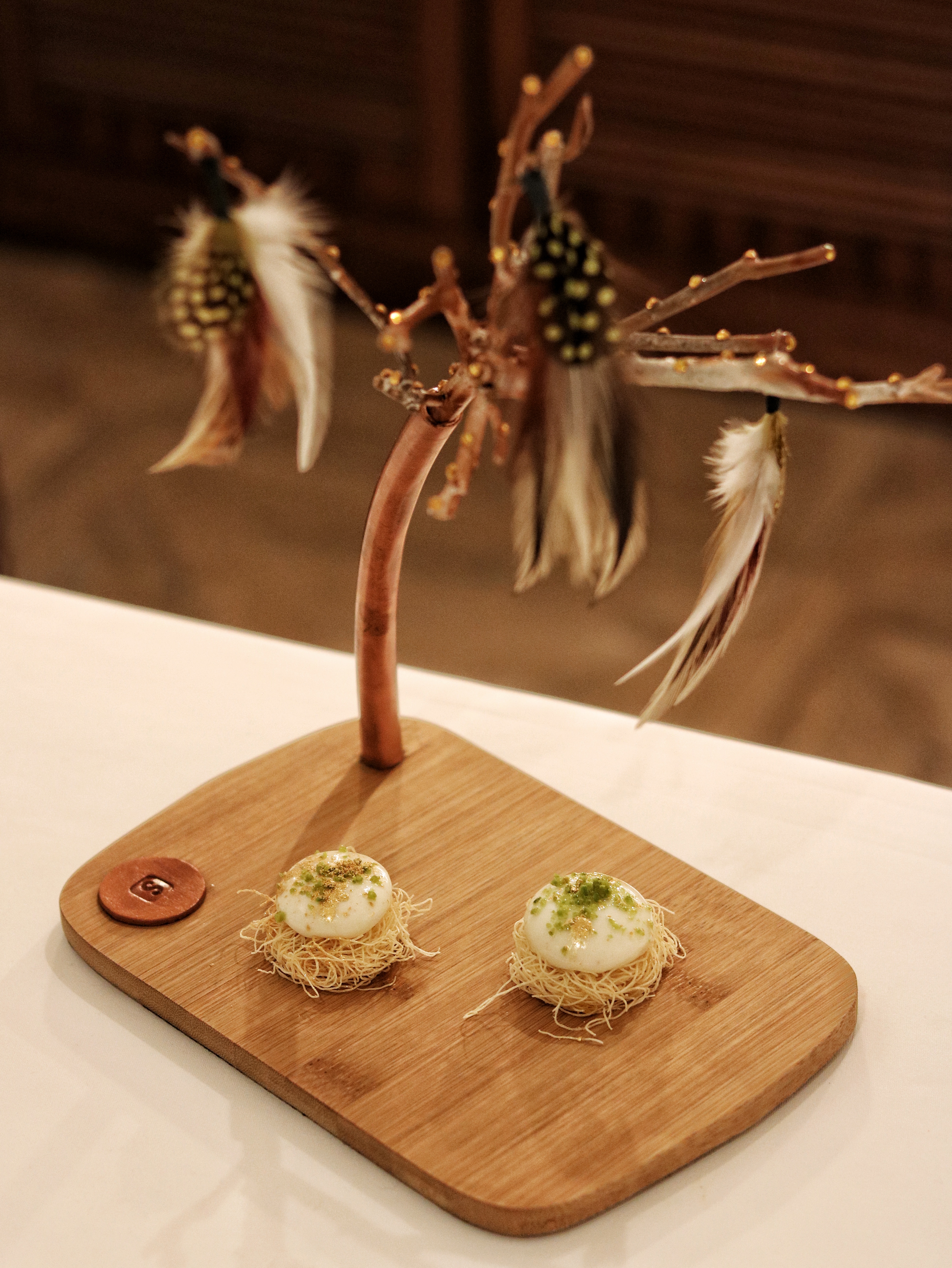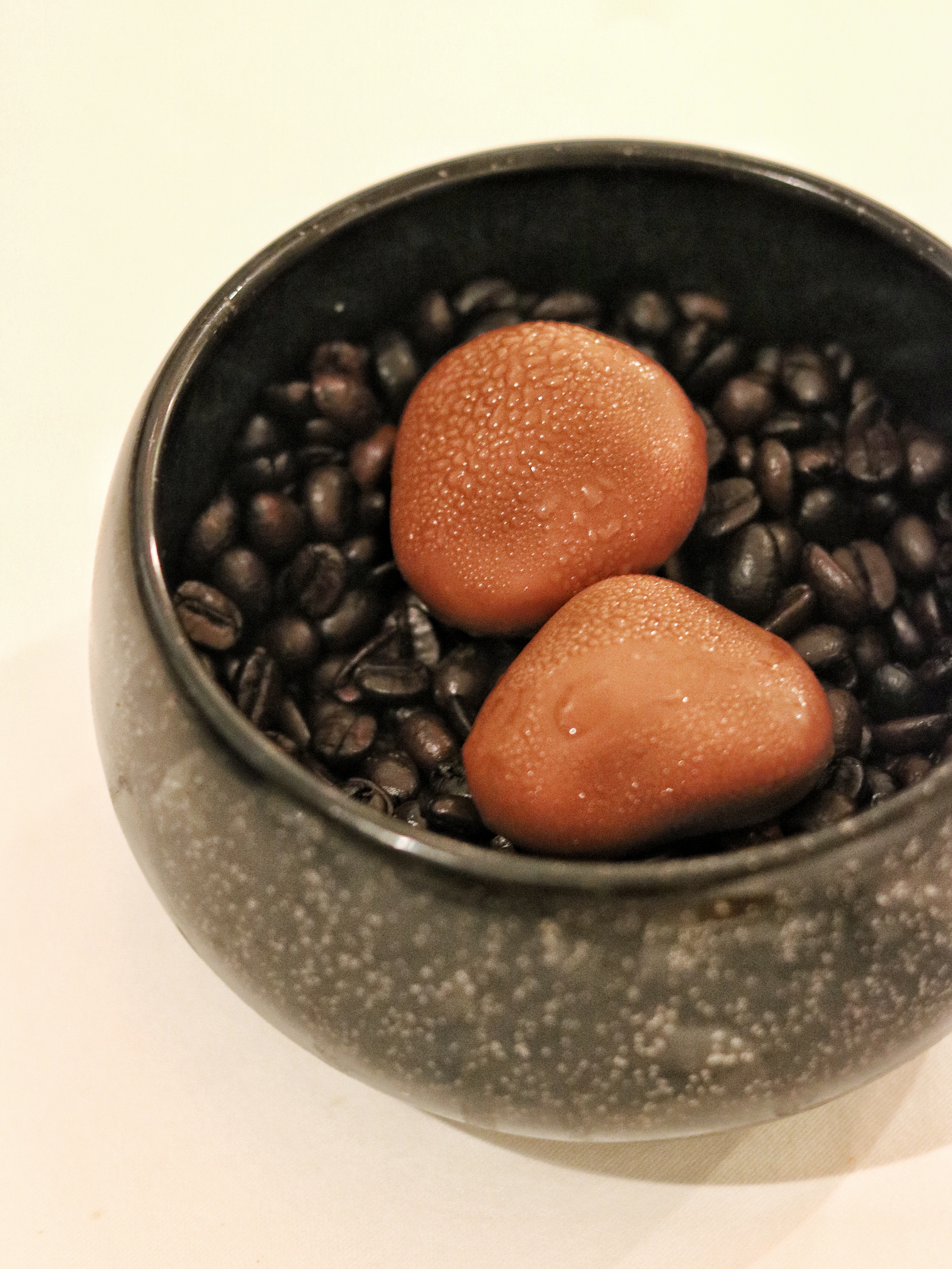 The last few dishes remain in their series of Petit Fours and we wonder if there are any more surprises in store. Well, it would be too amateurish to expect otherwise, am I right? The first one is an interpretation of a bird’s nest, where a condensed milk sphere, accented with saffron and pistachio, is meticulously placed over a bed of vermicelli to look like eggs inside a nest. To be eaten in one shot, this one instantly melts in our mouths, while we admire the crafty feathers used in the presentation of this dish. Another one bite wonder in this line-up is the gorgeous chocolate stone filled with liquid coffee. It’s almost like having a shot of choco-espresso, the flavors of which linger on your taste buds for a bit.