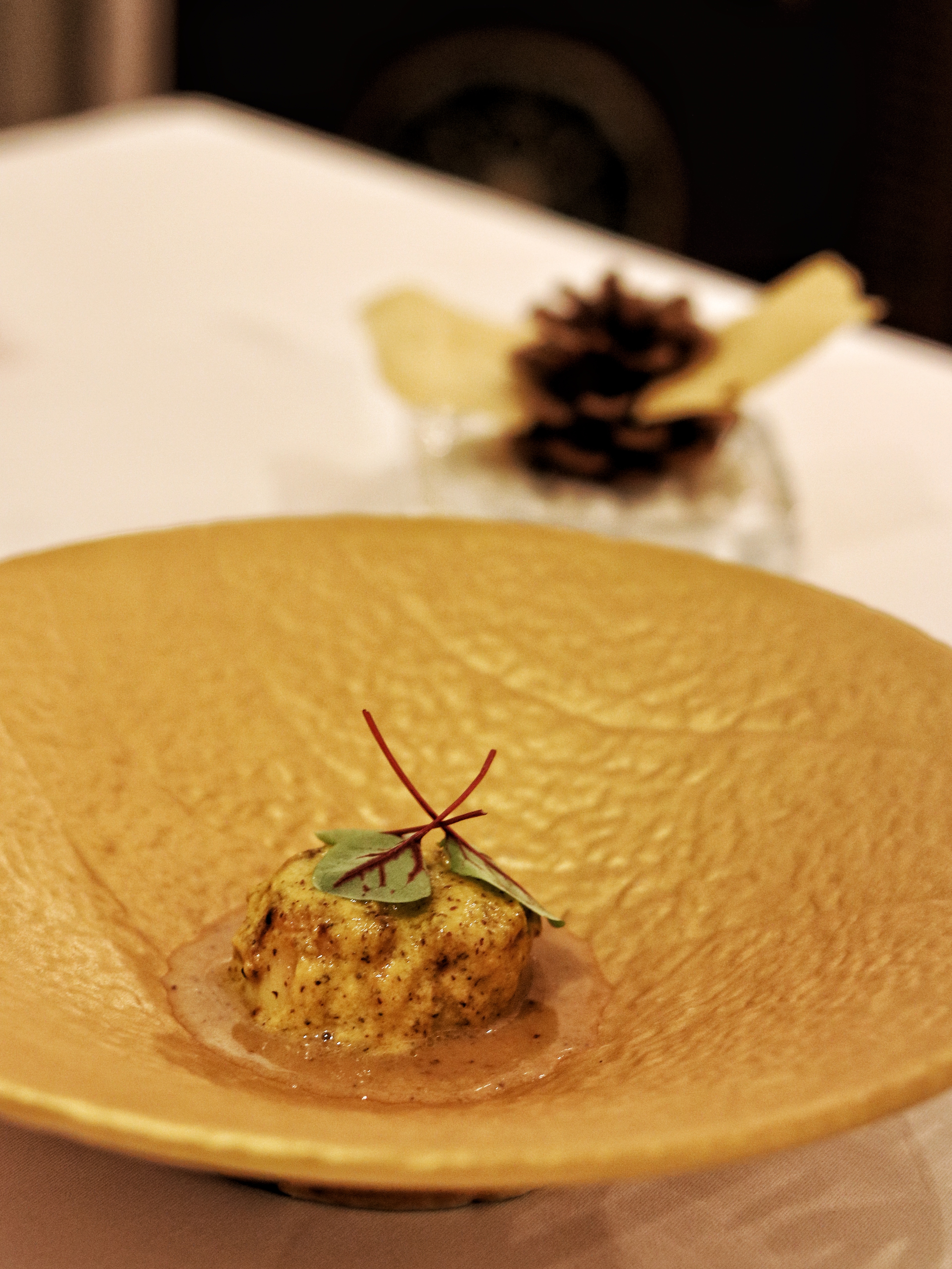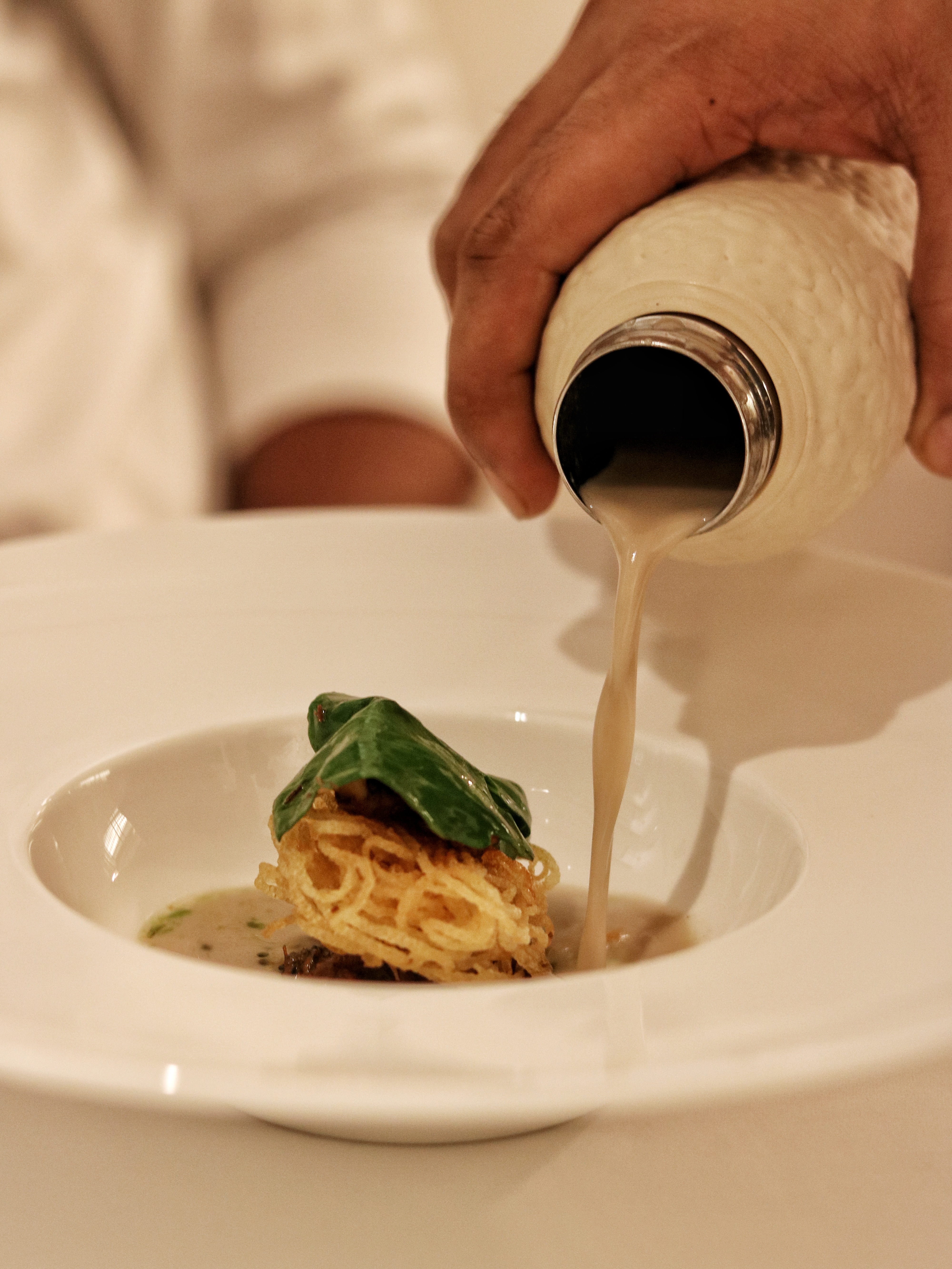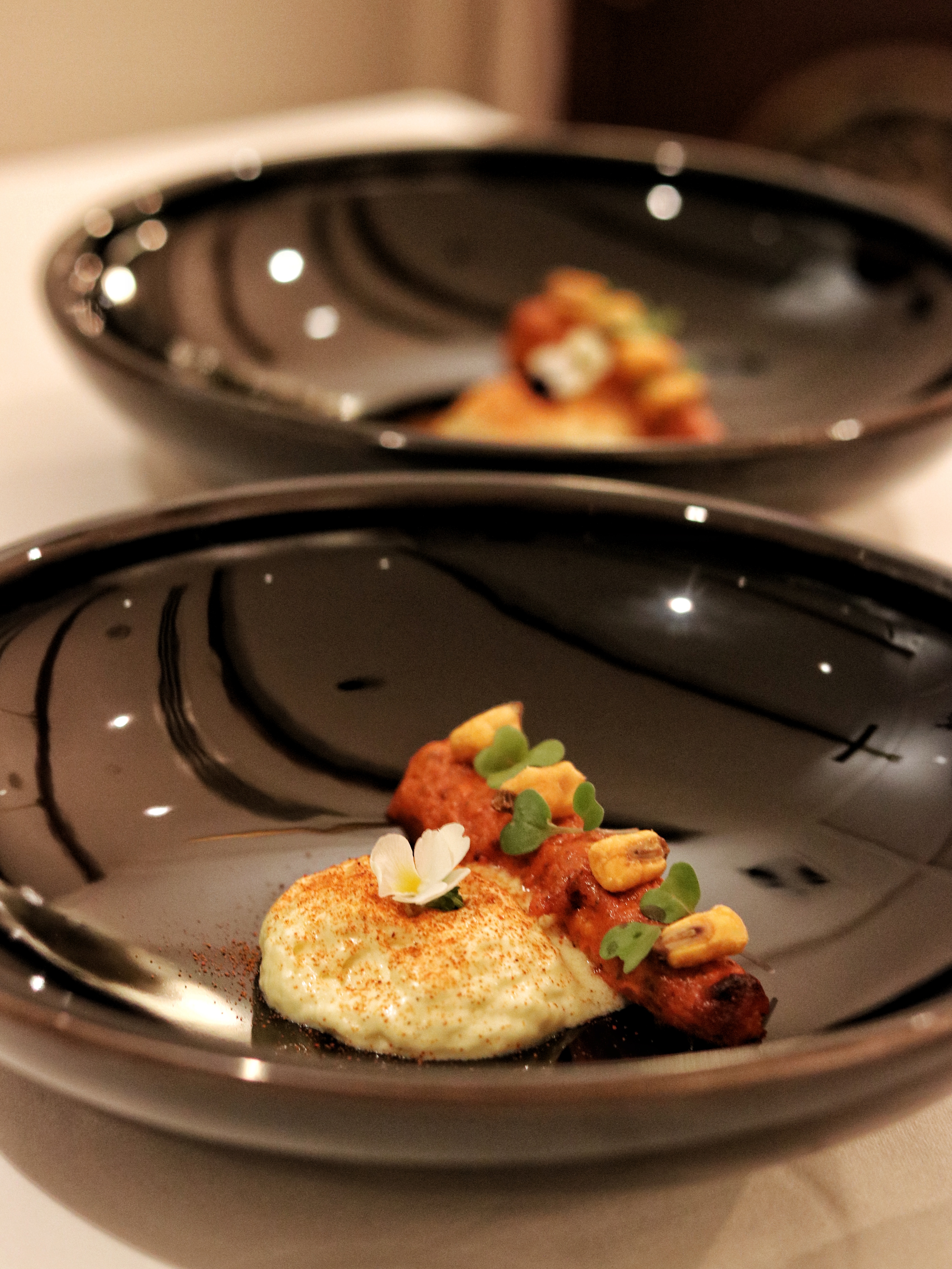 We move on to the Potage course with a very special Linda the sheep who holds the Maharashtrian inspired soup pandra rassa. Made with lamb stock and coconut milk, this broth is soothingly poured over a potato rosti and lamb roast enhanced with curry leaf oil and lamb floss. Himanshu asks us to mix up everything so we can enjoy all the different elements in every spoonful. Our Poisson course presents a lovely interpretation of the Hokkaido scallop. Drenched in French mustard which is fermented overnight to turn it into kasundi, the sesame accented scallop melts in the mouth. I almost forget about the neutralizing potato crisp on the side, and allow myself to dive right in, in the silky texture and intense flavor of the mustard scallop. If you have known me, you know how I always steer clear of scallops, but Trèsind is probably one of the very very few places where I keep all my reservations for food outside the door and step in with a clean slate, ready to devour anything and everything that’s put in front of me. And there’s none other than Chef Himanshu Saini to thank for that. To add a little variety to our palate, we are also asked to try the vegetarian counterpart of the fish starter with the Mais course. Roasted baby corn covered in a rich red marinade is served alongside a cloud of corn butter. The butter is so foamy, it feels almost weightless and we lick it off our plates in no time. My favorite part in this dish are the crunchy frozen dried corn kernels which I remind myself will make a great homemade snack while binge-watching Netflix.
