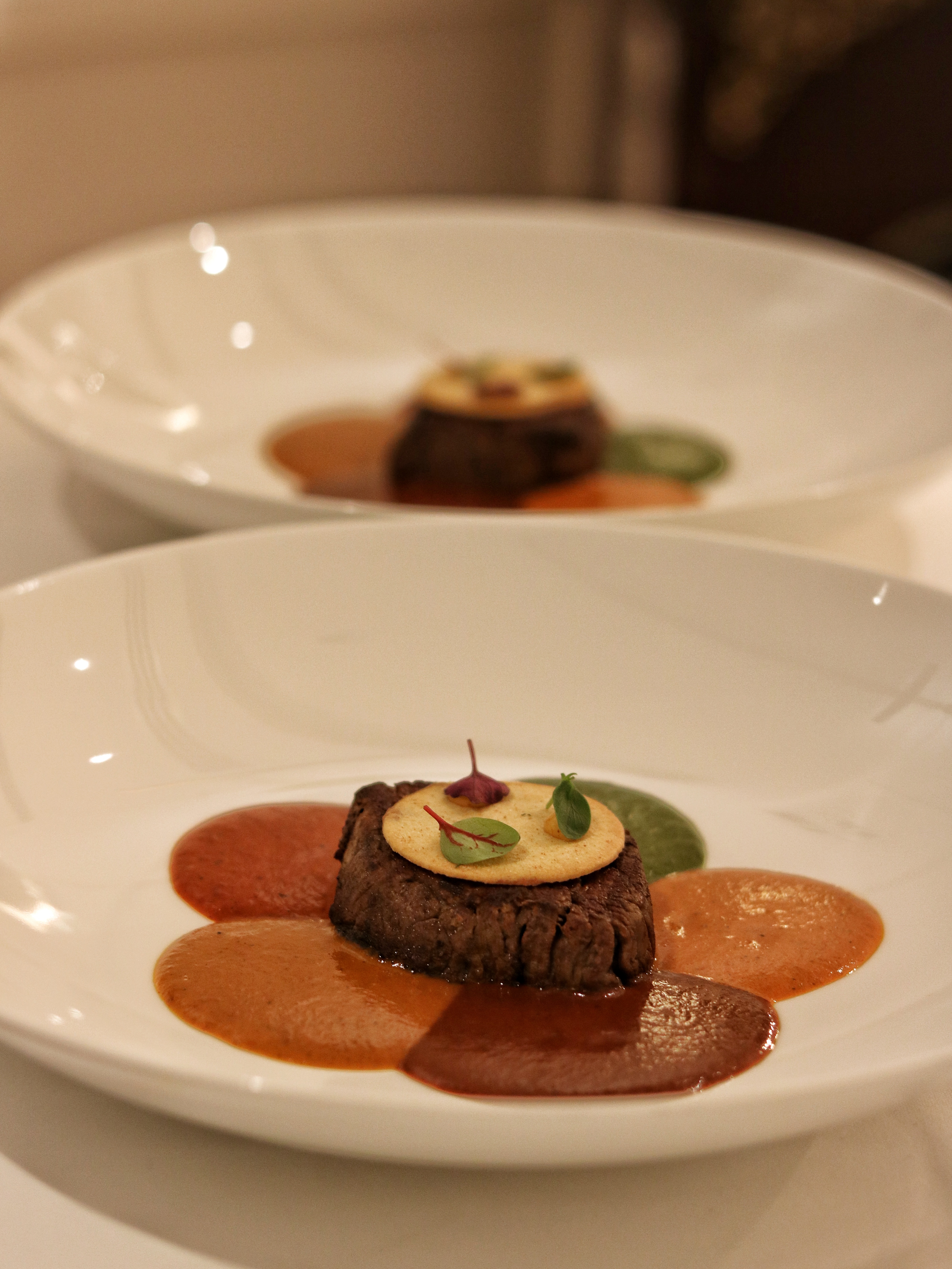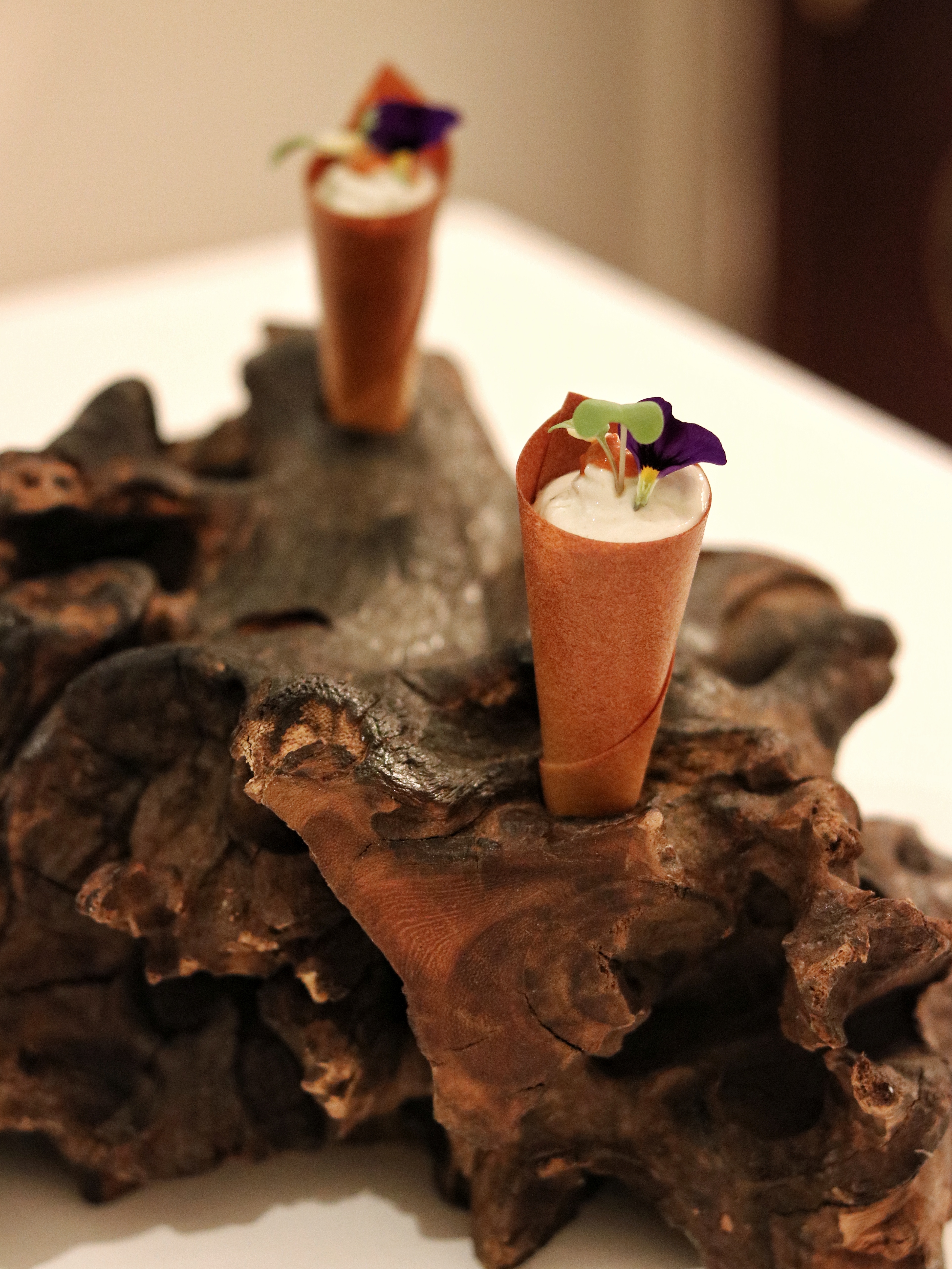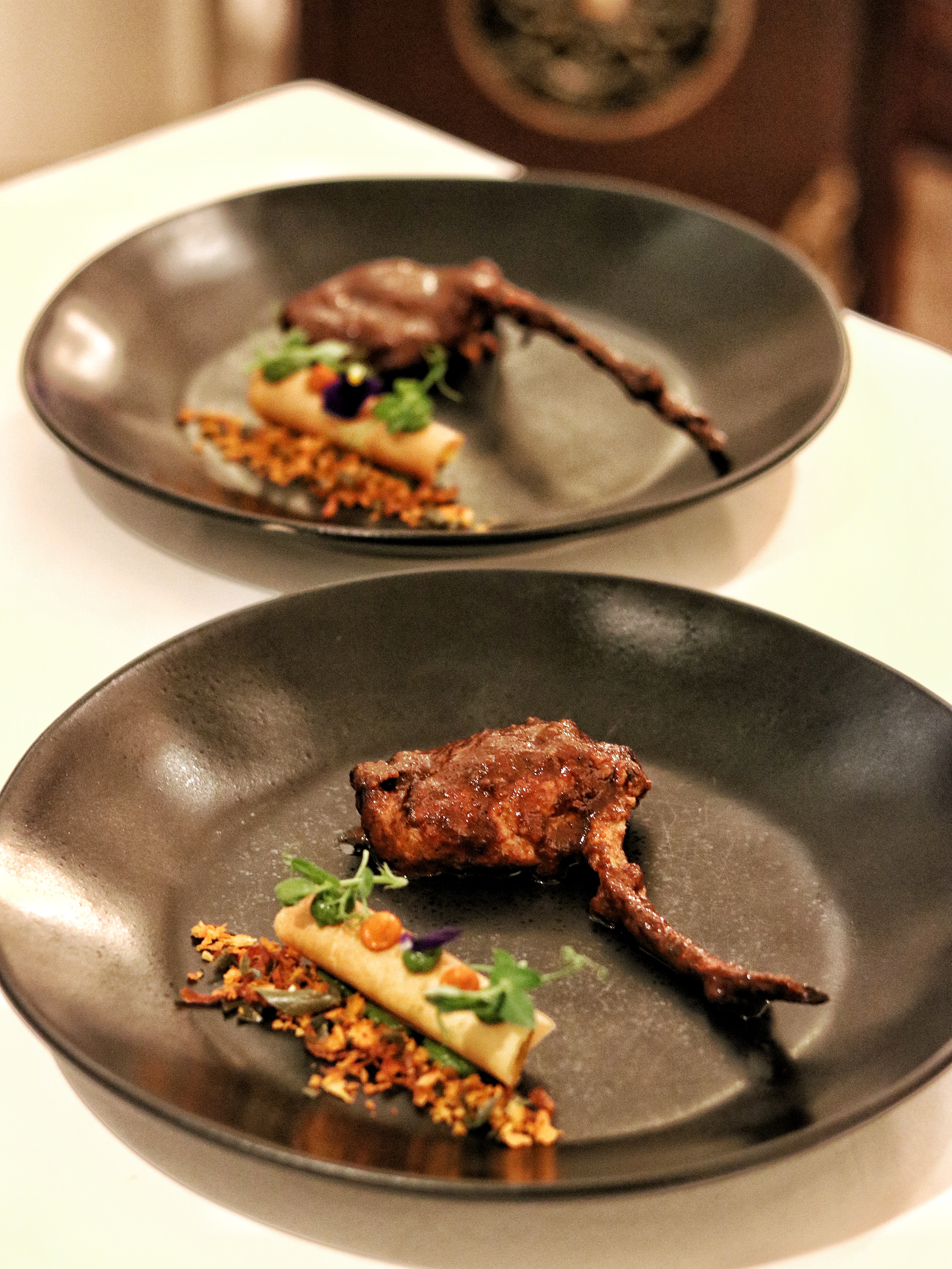 We move on to the Potage course with a very special Linda the sheep who holds the Maharashtrian inspired soup pandra rassa. Made with lamb stock and coconut milk, this broth is soothingly poured over a potato rosti and lamb roast enhanced with curry leaf oil and lamb floss. Himanshu asks us to mix up everything so we can enjoy all the different elements in every spoonful. Our Poisson course presents a lovely interpretation of the Hokkaido scallop. Drenched in French mustard which is fermented overnight to turn it into kasundi, the sesame accented scallop melts in the mouth. I almost forget about the neutralizing potato crisp on the side, and allow myself to dive right in, in the silky texture and intense flavor of the mustard scallop. If you have known me, you know how I always steer clear of scallops, but Trèsind is probably one of the very very few places where I keep all my reservations for food outside the door and step in with a clean slate, ready to devour anything and everything that’s put in front of me. And there’s none other than Chef Himanshu Saini to thank for that. To add a little variety to our palate, we are also asked to try the vegetarian counterpart of the fish starter with the Mais course. Roasted baby corn covered in a rich red marinade is served alongside a cloud of corn butter. The butter is so foamy, it feels almost weightless and we lick it off our plates in no time. My favorite part in this dish are the crunchy frozen dried corn kernels which I remind myself will make a great homemade snack while binge-watching Netflix.