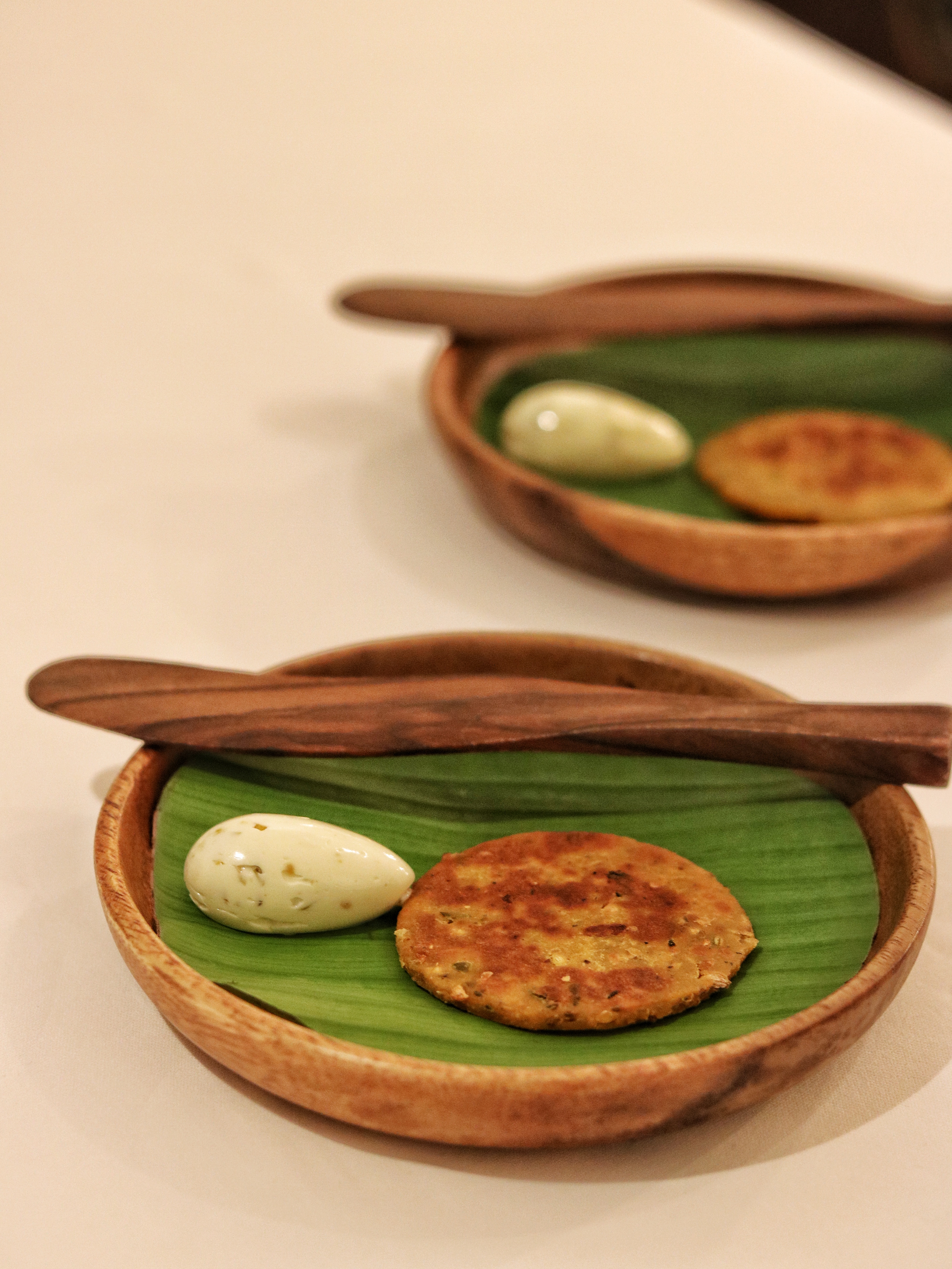 The French classical menu begins with a Hors d’oeuvre course of a pani puri balloon. Served on a vinyl record with guitar accent spoons to pay homage to their gramophone, this version of the ever-evolving chaat comes with Australian finger lime and popping candy. The brilliance of experimenting with pani puri never fails, and we are already in love with how this chapter is shaping up. Following the pani puri course is a bread appetizer, made with very little bread. An interpretation of a sandwich, this petite portion features a mushroom meringue top instead of bread followed by morel, truffle, lettuce, and a thin layer of crisp bread. Aptly titled morel sandwich, this one beautifully combines two of my favorites – mushrooms and truffles – into a bite sized bomb. Himanshu tells us how time sensitive this dish is, and asks us to eat it quick promising he’ll get us another one for a picture. I obviously eat the one that’s being photographed later. The next one in this series of small dishes is the chaat tart which is quite different from what we had seen in Chapter 1. A cold version of the famous Dahi Kebab is served in a tiny cornetto, made with dehydrated potatoes and filled to the brim with yogurt mousse, ginger strands, tempered mustard and a lot of herbs. We love how the prominence of each and every flavor stands out so well in this dish. The last one in this series is missi roti. A retainer from Chapter 1, the roti gets a spicy twist with chili butter as its accompaniment. The butter is so beautifully infused with pickled green chili, I almost find it difficult to stop myself from eating it all alone. Himanshu explains how they tried replacing the missi roti with so many other elements, but in the end it was only this that worked perfect. Again I complain to him on how I’d like a couple more missi rotis, while jokingly asking him to pack the butter for us to-go!