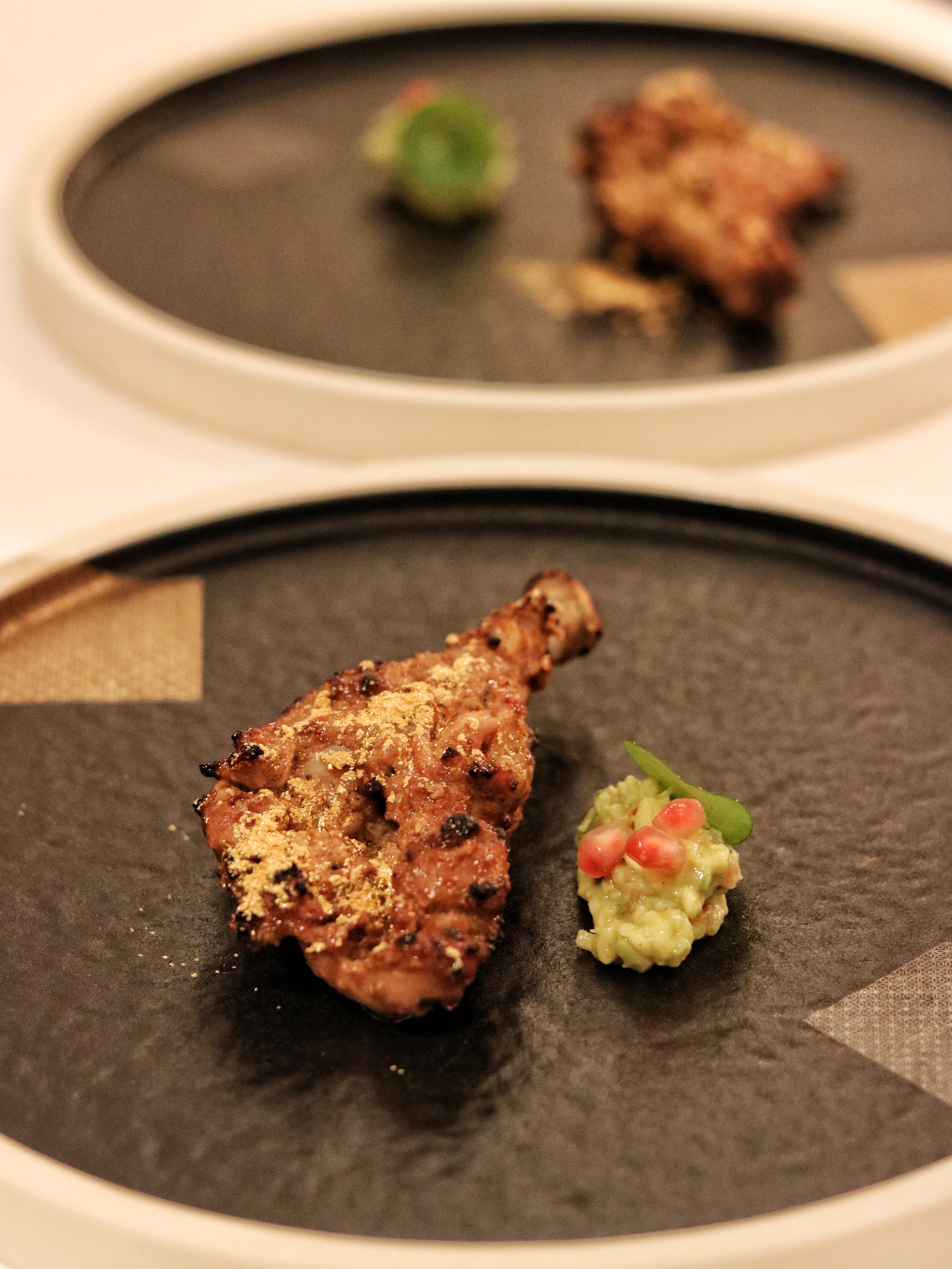 We move on to the Entree course with Himanshu’s Indianized version of French roast chicken. He specifically asks us to eat this with our hands, and well, who are we to say no to that! A beauty in every possible way, this juicy piece of cotton like chicken is marinated with dried pomegranate and mango powder, dusted with a generous sprinkle of edible gold, and served with a creamy avocado kachumber. Himanshu gives us an interesting inside scoop of how this dish was conceptualized just a couple of days before launch. While they had settled in for a butter chicken souffle, they realized the logistics wouldn’t really work unless every table was on the same course at the same time, which is why they decided to give it a miss and create this roast chicken instead. He also stresses on how their menu keeps on changing with minute improvisations playing out on every single dish, every single evening. As our talks progress, we are brought another Roast course that’s an exact replication from Chapter 1. A favorite among many patrons, the black pepper lamb chop stays put in this menu and comes all dressed up in rich spicy marinade with a side of potato filled dosa and some dried moringa, coconut and onion flakes on the side. Like most other dishes, this juicy piece of lamb too is cleaned off as quickly as it arrives. We come to a conclusion that Trèsind definitely knows how to do their meats really well. Be it the Indian steakhouse (and the endless selection of meats it presented) that we experienced not more than 2 months ago, or the multiple variations of lamb chops, beef medallions and chicken kebabs we’ve tried at different editions of Trèsind and Carnival by Trèsind seasons, if there’s something that remains unchanged, it is their level of meaty perfection.