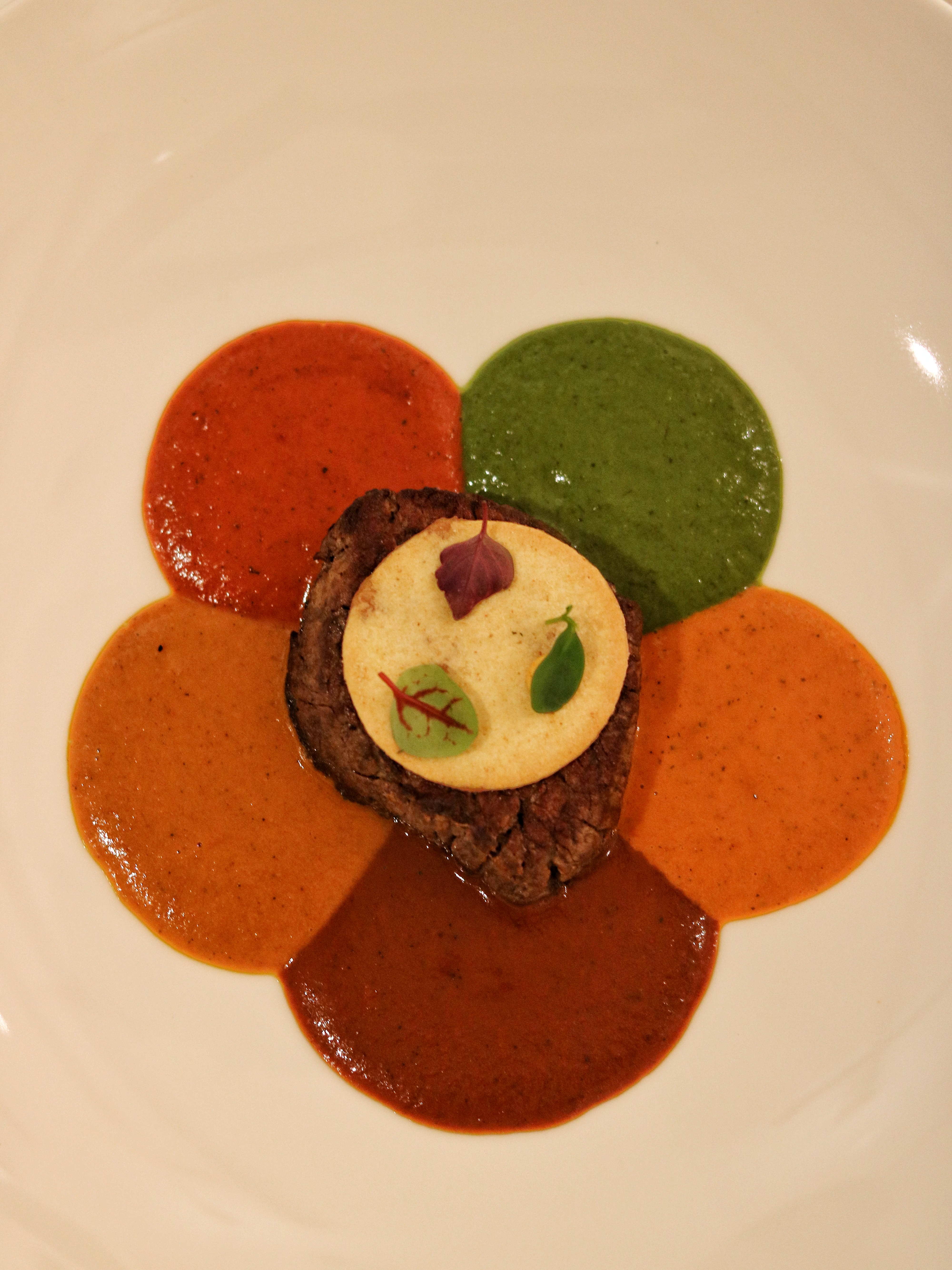 Bringing back memories of the Indian Steakhouse Ramadan Menu at Trèsind, we are asked to choose our weapon from a slick collection of steak knives for our Releve course. The Wagyu steak is yet another dish retained from Chapter 1, but gets an uplift with the variety of sauces it is served with. Our medium done wagyu is placed in the center of the dish, and we gradually watch the staff pour the curries one after the other to create a rich toned flower. He starts with a vermillion hued tomato basil sauce, moving on to a rich forest colored spinach dill, then a dark maroon chili oregano, a bright orange biryani sauce and a deep brown vindaloo with rosemary. While all the sauces pair up right with the perfectly done steak, the tomato basil and chili oregano sauces have my heart.