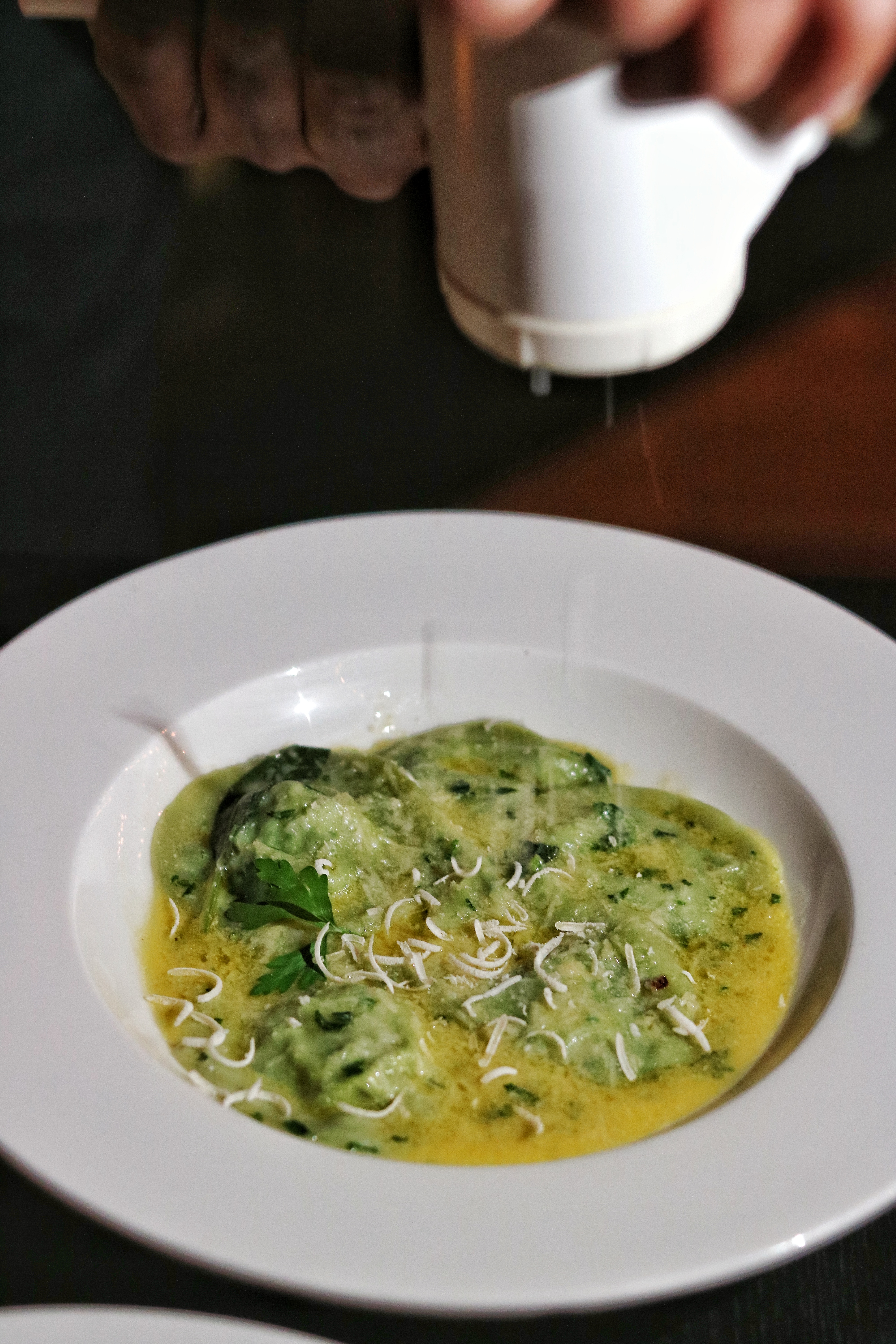 Next up was the Risotto ai frutti di mare. A beautifully put together dish featuring the freshest prawns and calamari with Italian rice, this risotto is a must have for seafood lovers. We asked to exclude black mussels for this one, but it’s included with this dish. For pasta, Darryl brought us the chef’s favorite, Ravioli con spinaci e ricotta. The big specialty about this ravioli is that the homemade pasta is made without any egg. So it’s absolutely vegetarian friendly. The al dente ricotta filled pockets drenched in a rich sage butter sauce almost melt in your mouth.