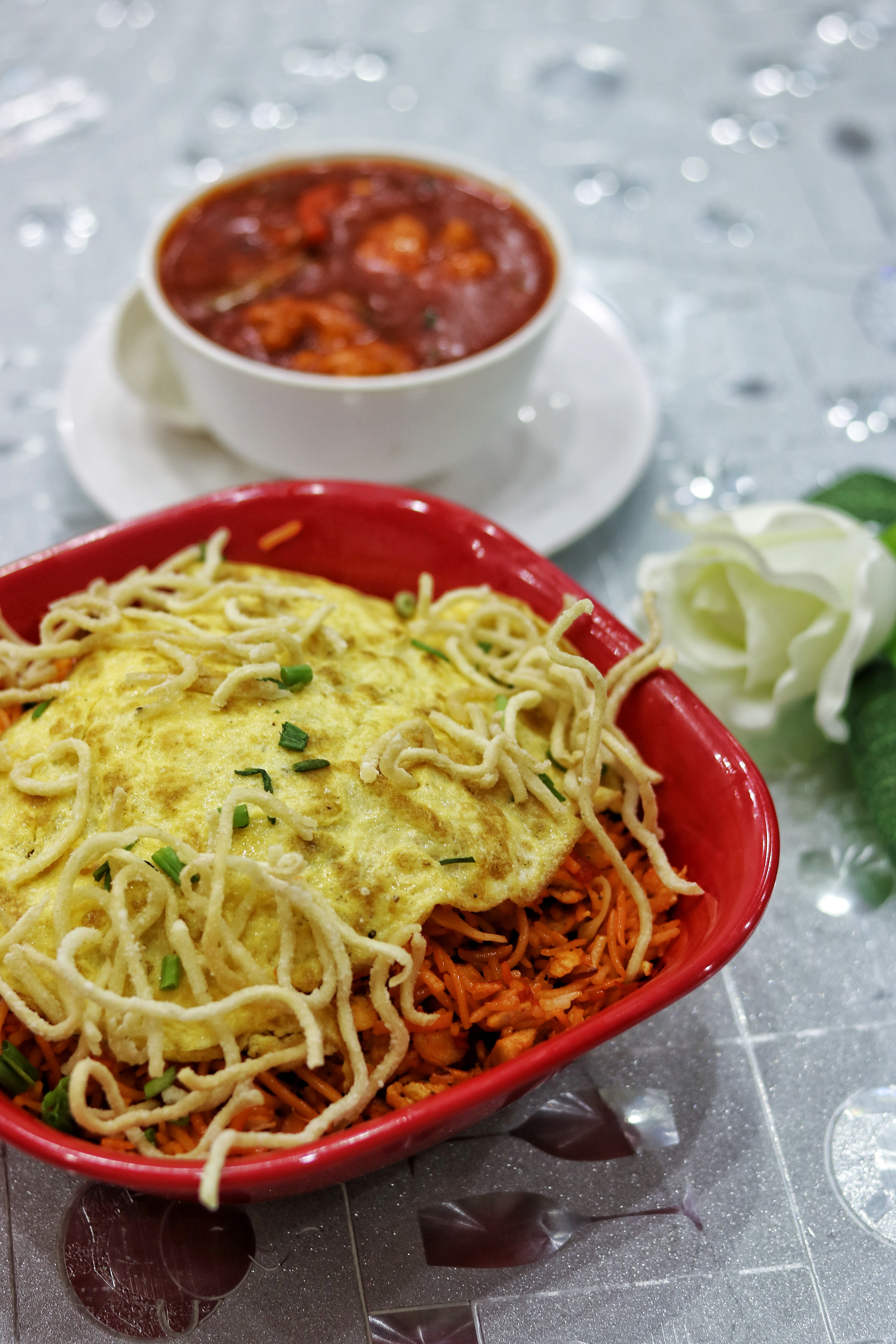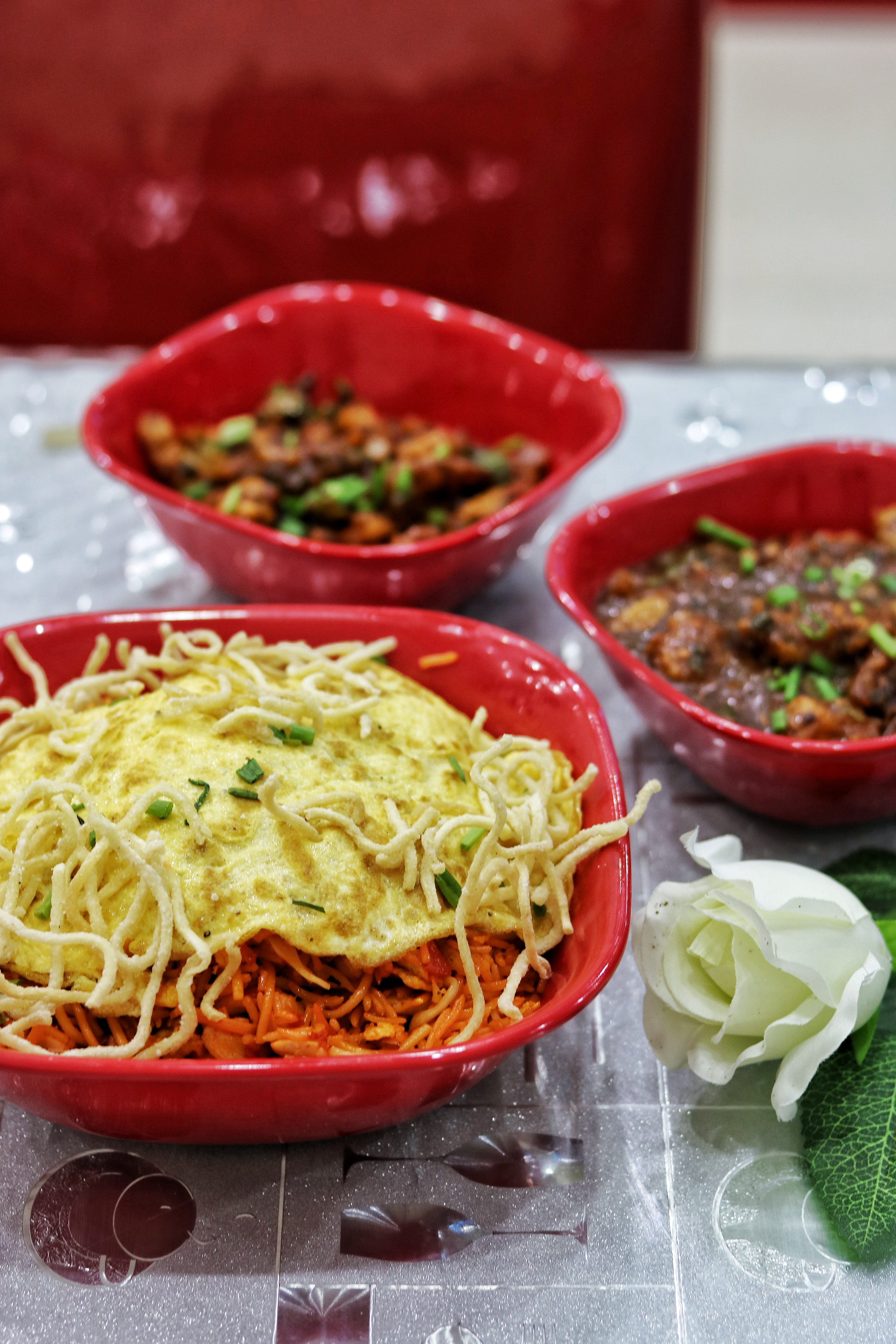 Moving on to mains, we were brought a selection of the most popular Chinese dishes – triple Schezwan rice with gravy, chicken Manchurian and prawns Manchurian. The rice dish, mixed with noodles, topped with a fried egg and garnished with crispy noodles was such a filling and comforting dish. I didn’t quite like the gravy though. I feel the dish is already so full of flavor, adding a gravy doesn’t do justice to the dish.
