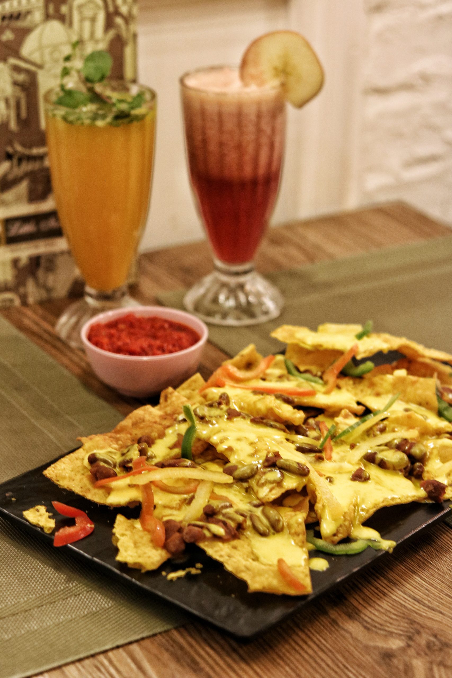 Then came in the Mexican side of things in the form of Nachos and Corn Cheese Balls. From everything we tried, the nachos had the maximum element of fusion. The tortilla chips were replaced by khakda which made the refried beans almost look like rajma. Moreover the cheese sauce was strikingly bright yellow – giving it a very haldi look. The corn cheese balls on the other hand were quite soft and gooey, but the corn was pretty sparse inside.