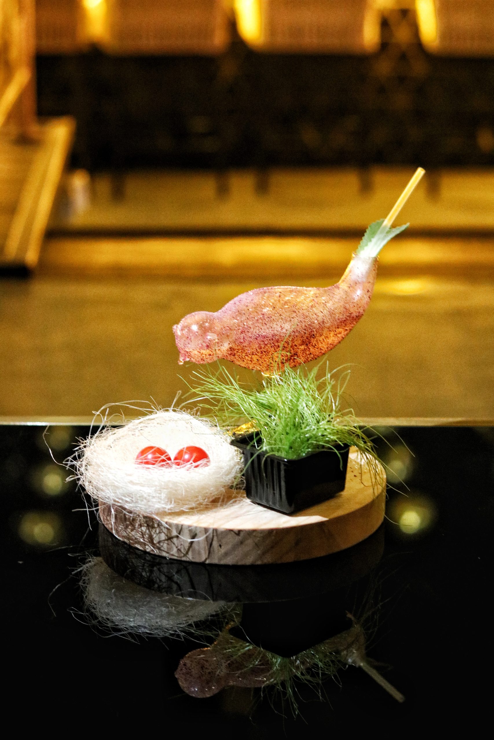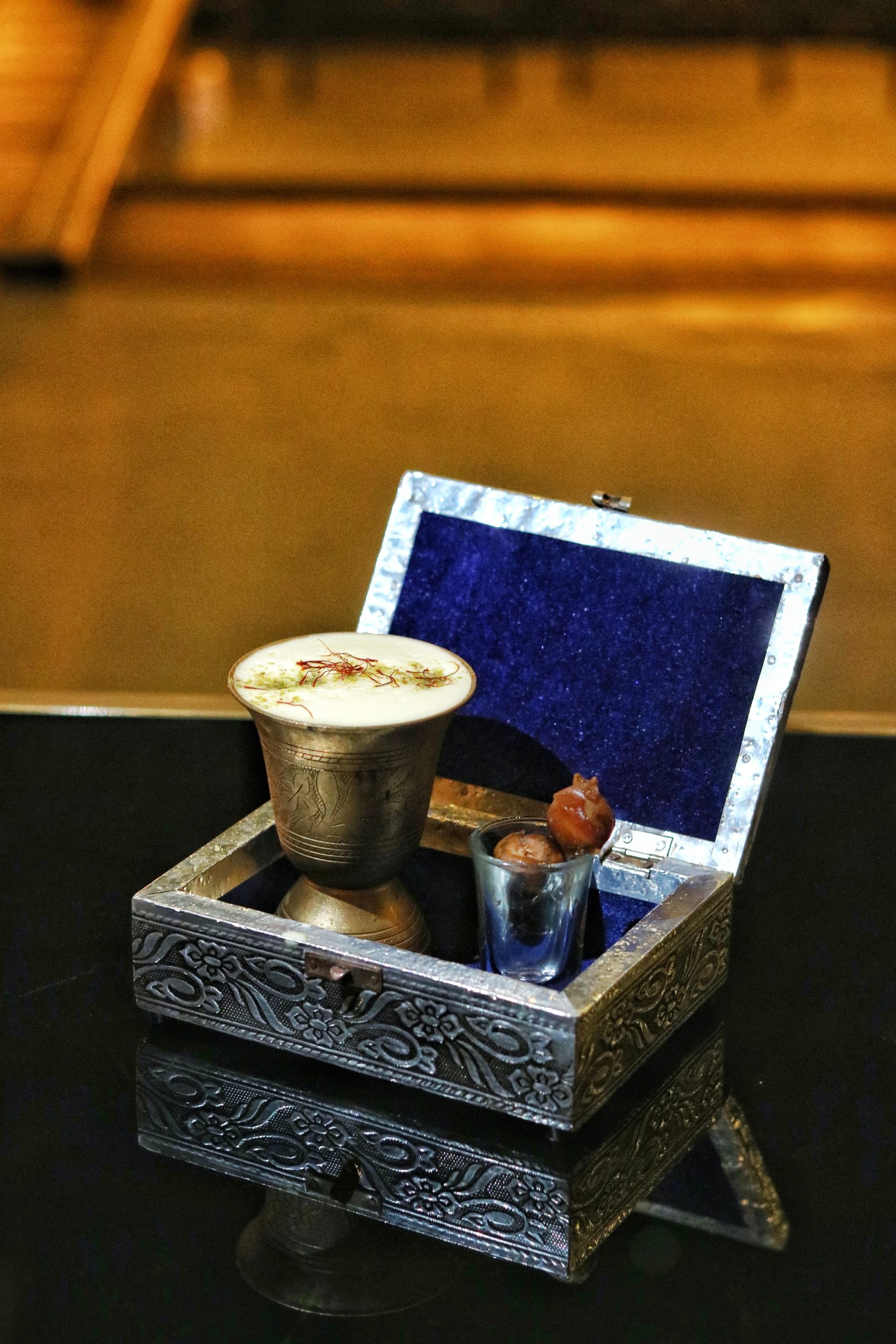 We start with the gorgeous Mocking Bird and the classy Royal Sour. A sweet blend of strong flavors, the Mocking Bird brings together rose syrup with peach puree and lemon juice. There’s also a hint of turmeric root in the mix. And that presentation is simply wow! Quite a royal affair, the exquisite Royal Sour combines lime juice with saffron syrup and is topped with egg white foam. Don’t miss the dates on the side.