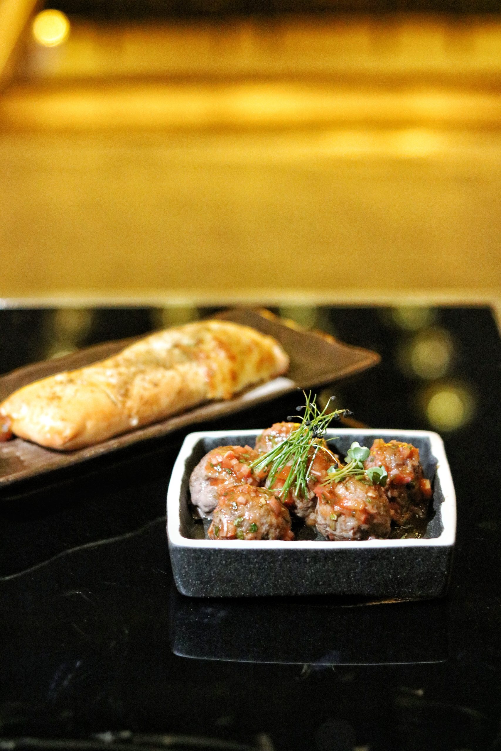 For our starters, we pick four dishes, that each stand out for their distinct flavors. First one is the AER Wellness which is a refreshingly healthy salad, thanks to the mix of romaine lettuce, endive, beetroot spirals, cucumber, orange pieces and quinoa. Moreover it is sprinkled with chickpeas and sunflower seeds, and drizzled with s salted maple butter dressing. Next is the Sicilian Arancini which is essentially tomato ragu based rice balls stuffed with cheese and mushrooms. These are incredibly creamy and melt-in-your-mouth. We also opt for the Bruschetta trio which features a selection of unique combinations, and is quite good for sharing, especially when everyone’s fond of one of these three toppings. While I am not particularly fond of tuna and green apple, the tomato caponata is fair, and I love the mushroom and cheese laden bruschetta. Our last starter, before we indulge in mains are the Meatballs. Made with beef mince and topped with salsa bravas, these meatballs are served with cheesy garlic bread, making them the ideal meat+carb bites with drinks.