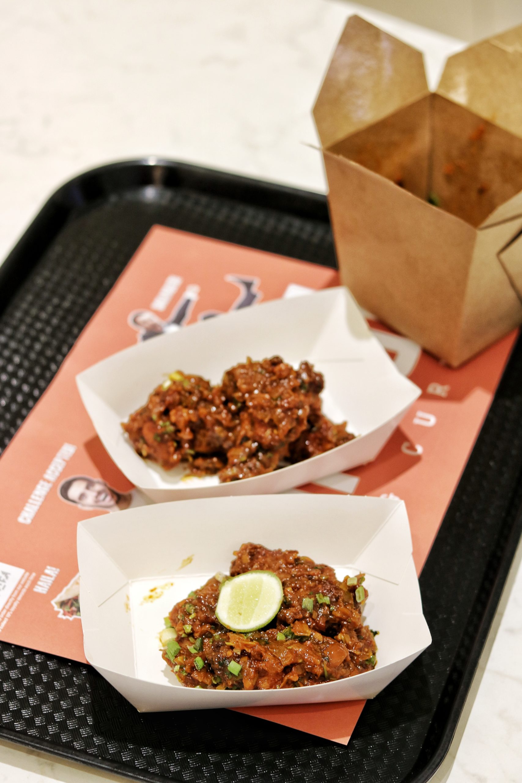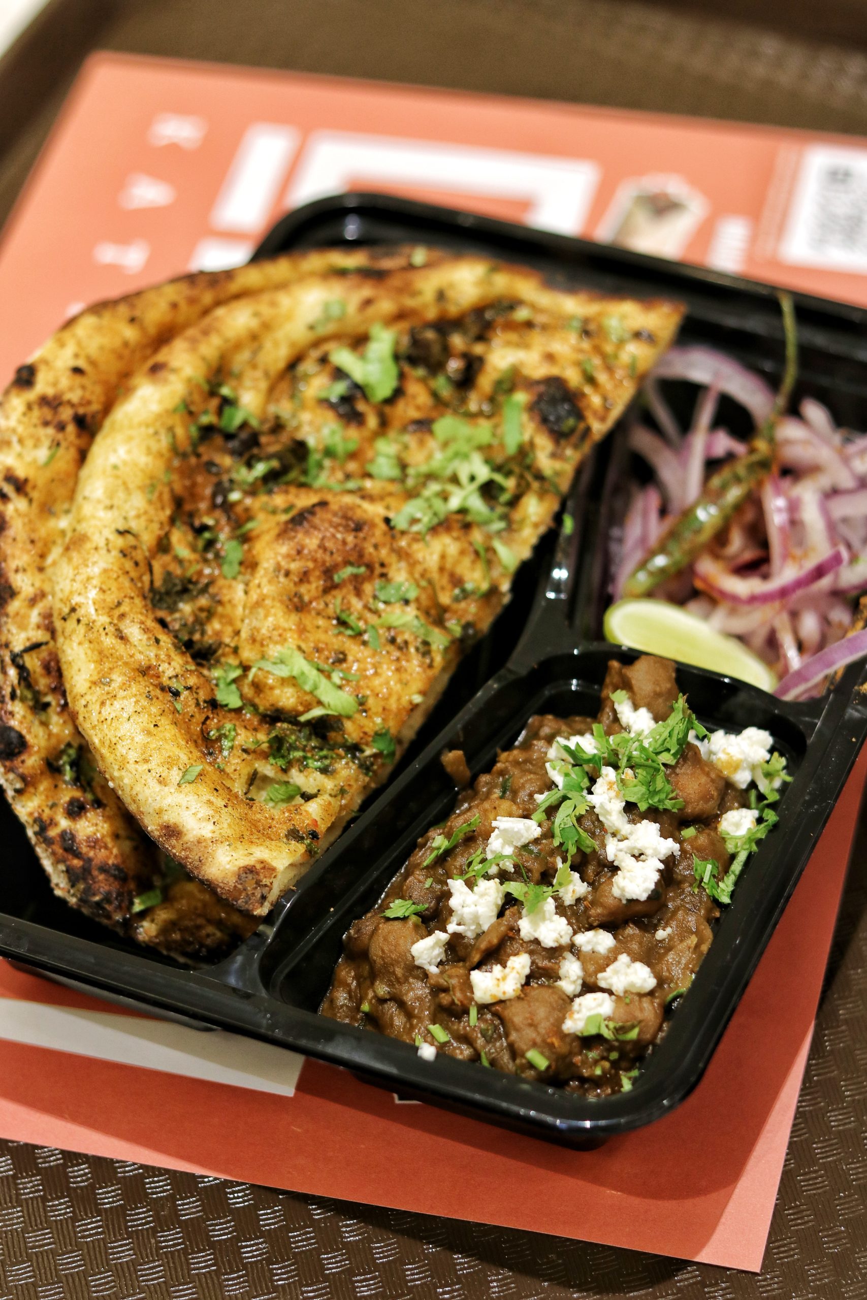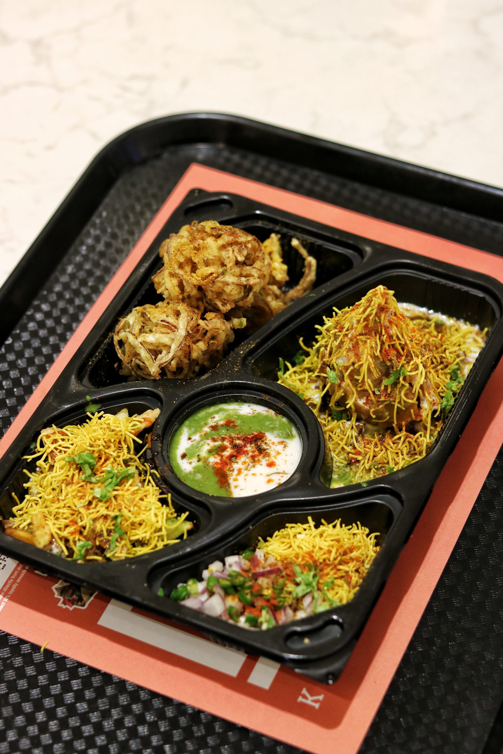 We started our food discovery with their healthy tandoori chicken. For one, I loved the way it was presented in the box – half salad and half chicken – a good way to balance the protein with fresh veggies. And the chicken, OMG. It was super succulent and almost melt-in-your-mouth tender. A great choice for those looking at something that would match up to individual healthy protein bowls. Next we tried the chaat platter. I have to make a mention of their packaging here. All their dishes were served in take away boxes, in fact some of them in a very sustainable packaging, and everything was easy to pack up and take away, whether you were taking away the entire dish, were halfway through it or just had a little left that you wanted to finish later. Our chaat platter came with samosa chaat, sev puri and onion pakoda with chutney in the center and some extra farsan on the side. I obviously loved everything, but my favorite was the sev puri, which although not very common, was paired with yogurt that added a whole new level of refreshing flavors to it. This is commonly known as SPDP (sev puri dahi puri) in various parts of India. Chicken wings flew in next packed in an Asian take out box. A good point to add here is that they are working towards making all their packaging eco-friendly and plastic-free, and I wish them all the very best towards achieving this sustainable goal. The wings were covered in a spicy gravy-esque sauce, which was sort of a replacement for any sauce on the side. Slightly spicy but finger licking delicious, this one’s going to get your hands messy, so you might want to ask for a few wet tissues with it.