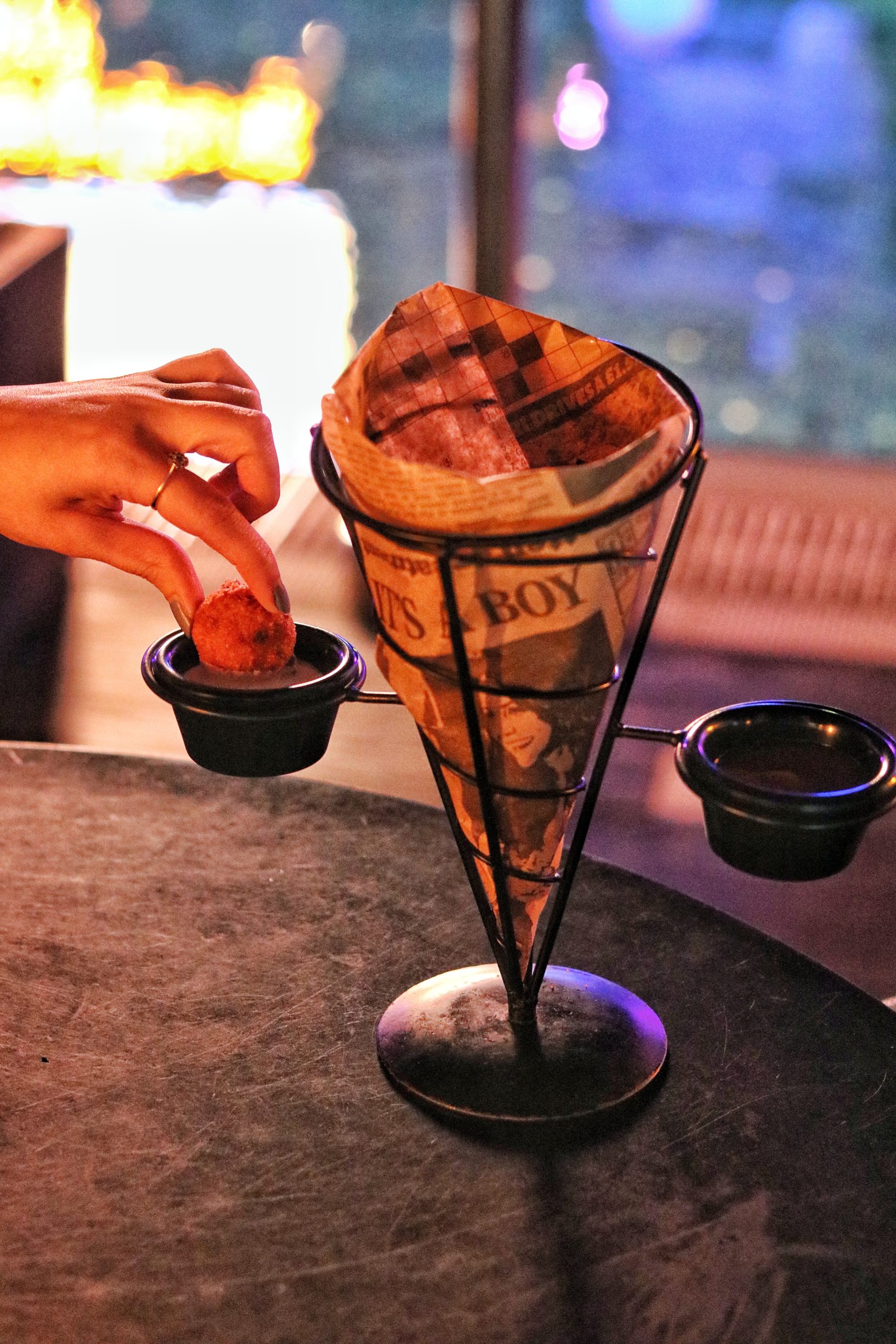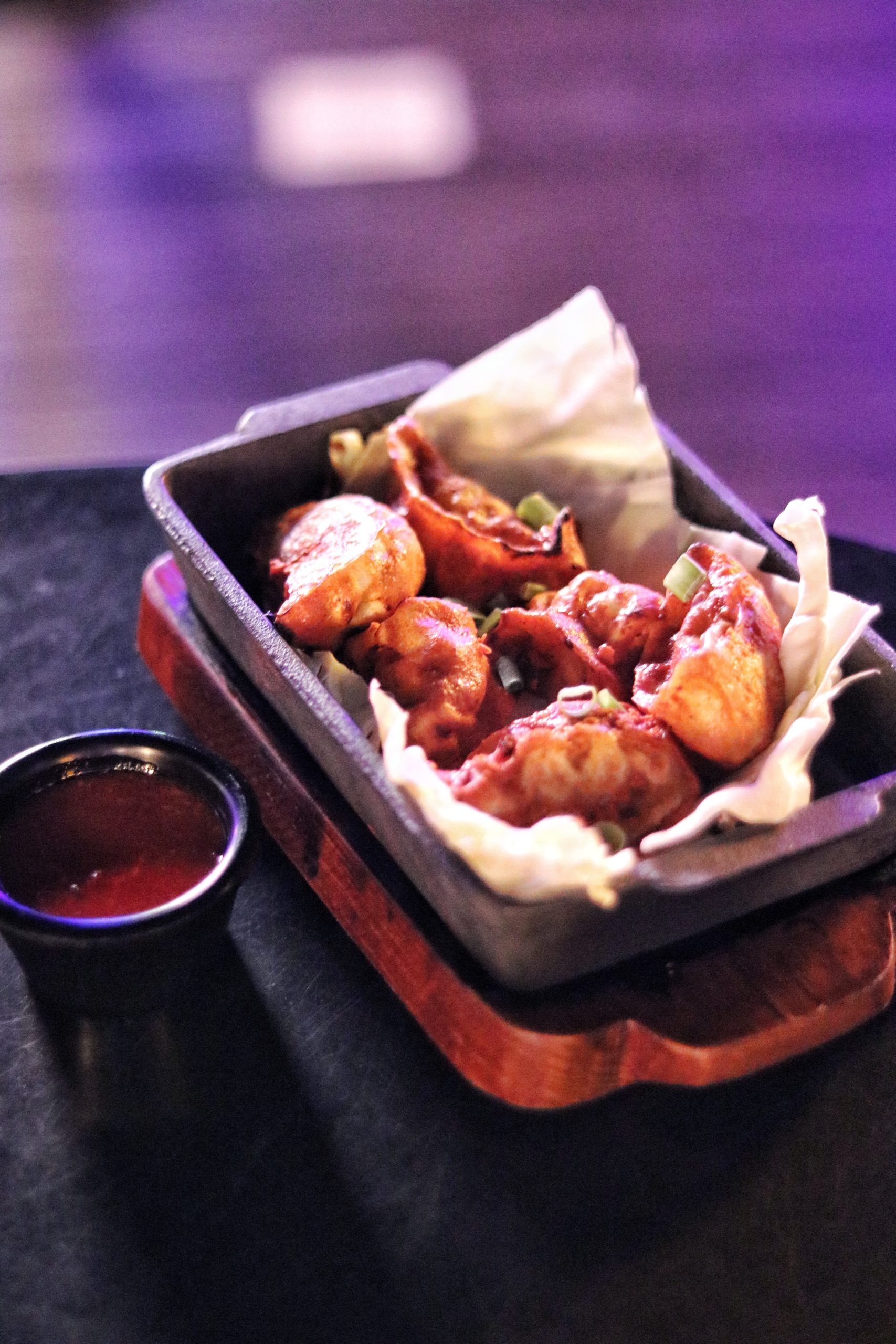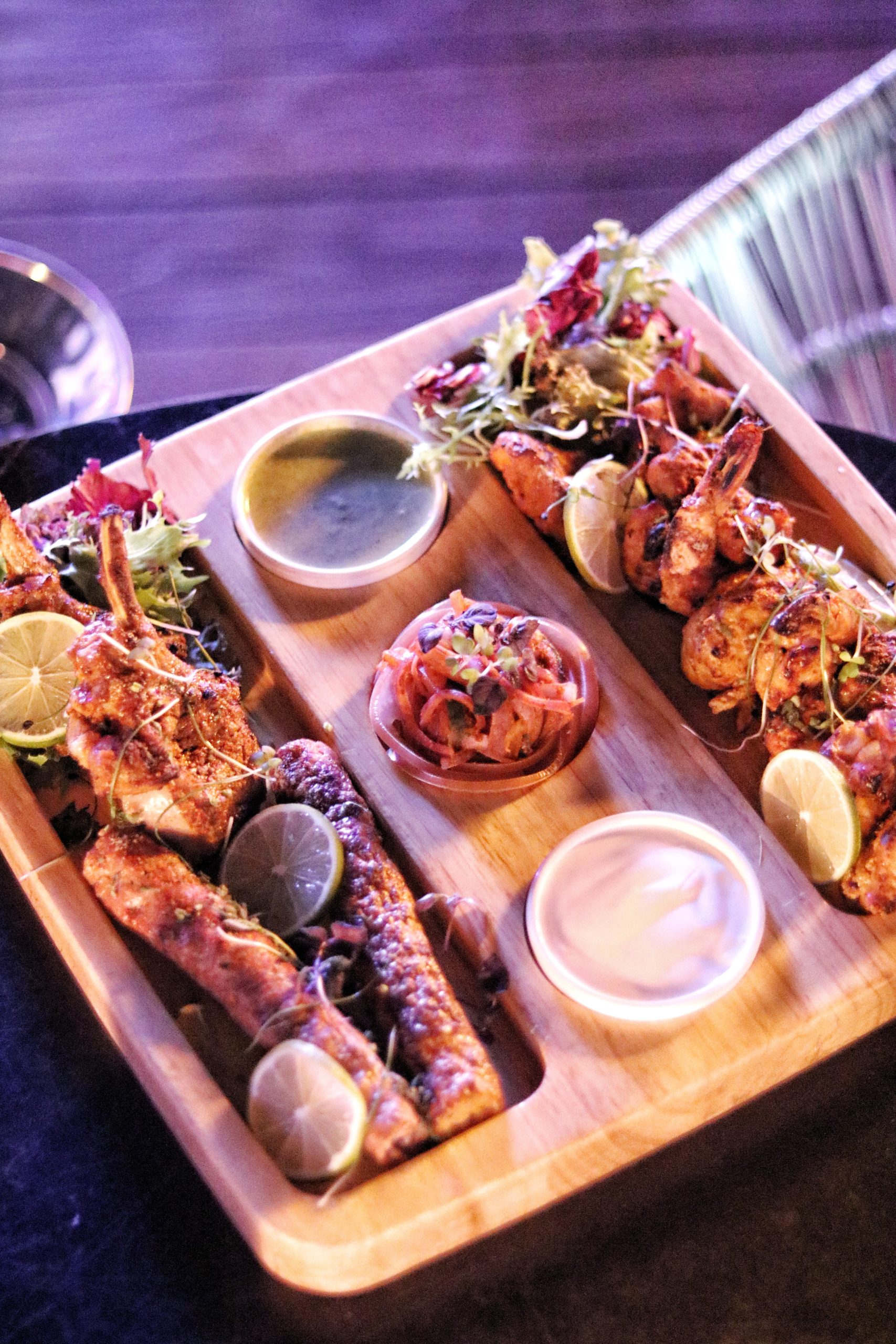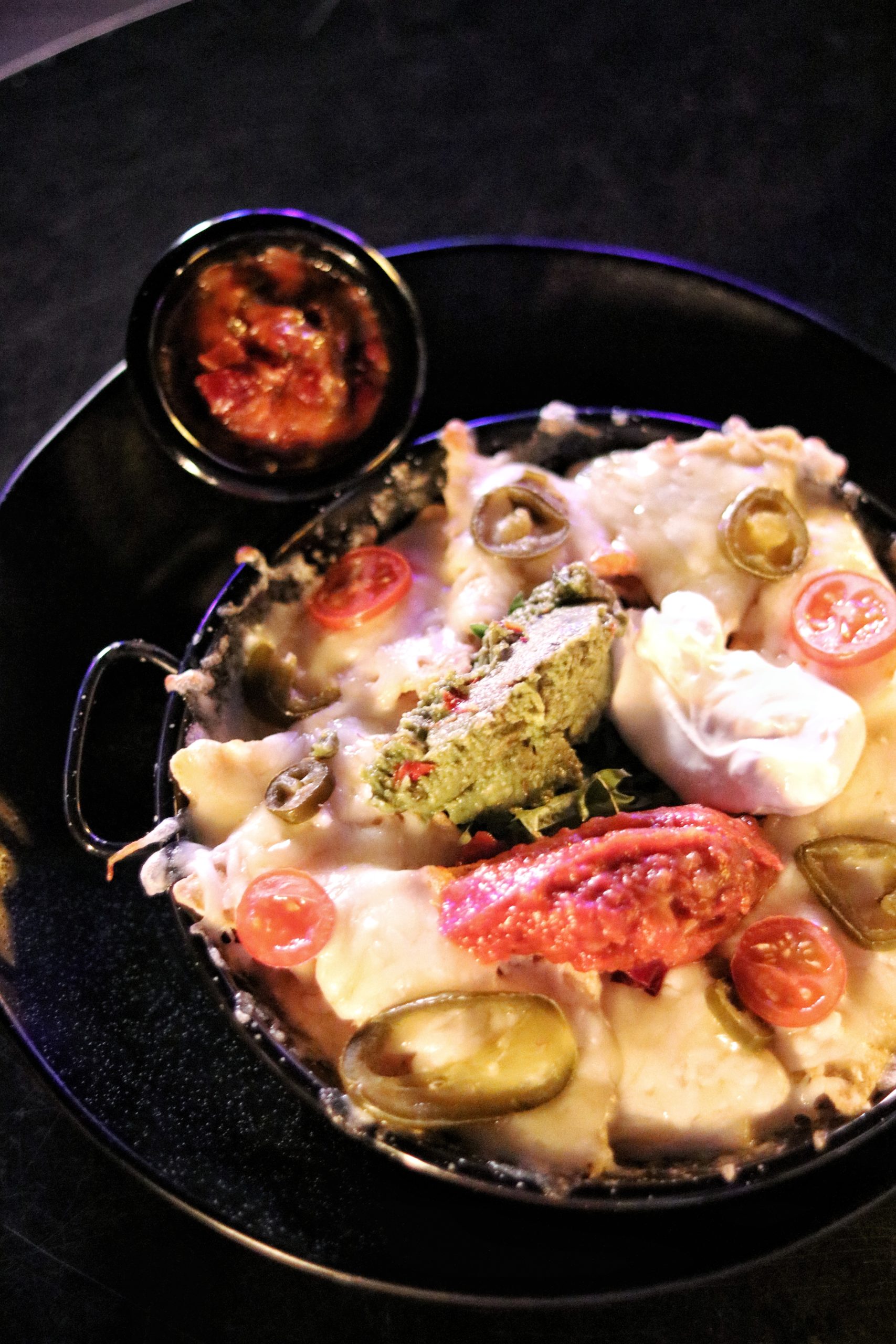 My plus one started with a grape mint sheesha (her favorite) and we chose to go with the cocktails recommended by the bartender. I tried a floral rose and peach drink flavored with kaffir lime, while my friend went with a fruity concoction of orange, pineapple and grapefruit served in a tiki glass. For starters, we opted for their nachos that were served baked with cheese in a skillet, topped with generous dollops of salsa, sour cream and guac + refried beans on the side. These were better eaten with hands. The next starter was Tandoori Chicken Momos, which as the name suggests, came filled with hot tandoori chicken stuffing with a spicy sauce on the side. I loved how tender, juicy, hot and spicy these were – all at the same time. Another starter which the chef insisted we try was Jalapeno cheese poppers. My friend is anti-jalapenos (she gives me all the jalapenos in the cinema), but surprisingly she loved these. The poppers came paired with potato wedges in a cone with ketchup and mayo dipping sauces on the side.