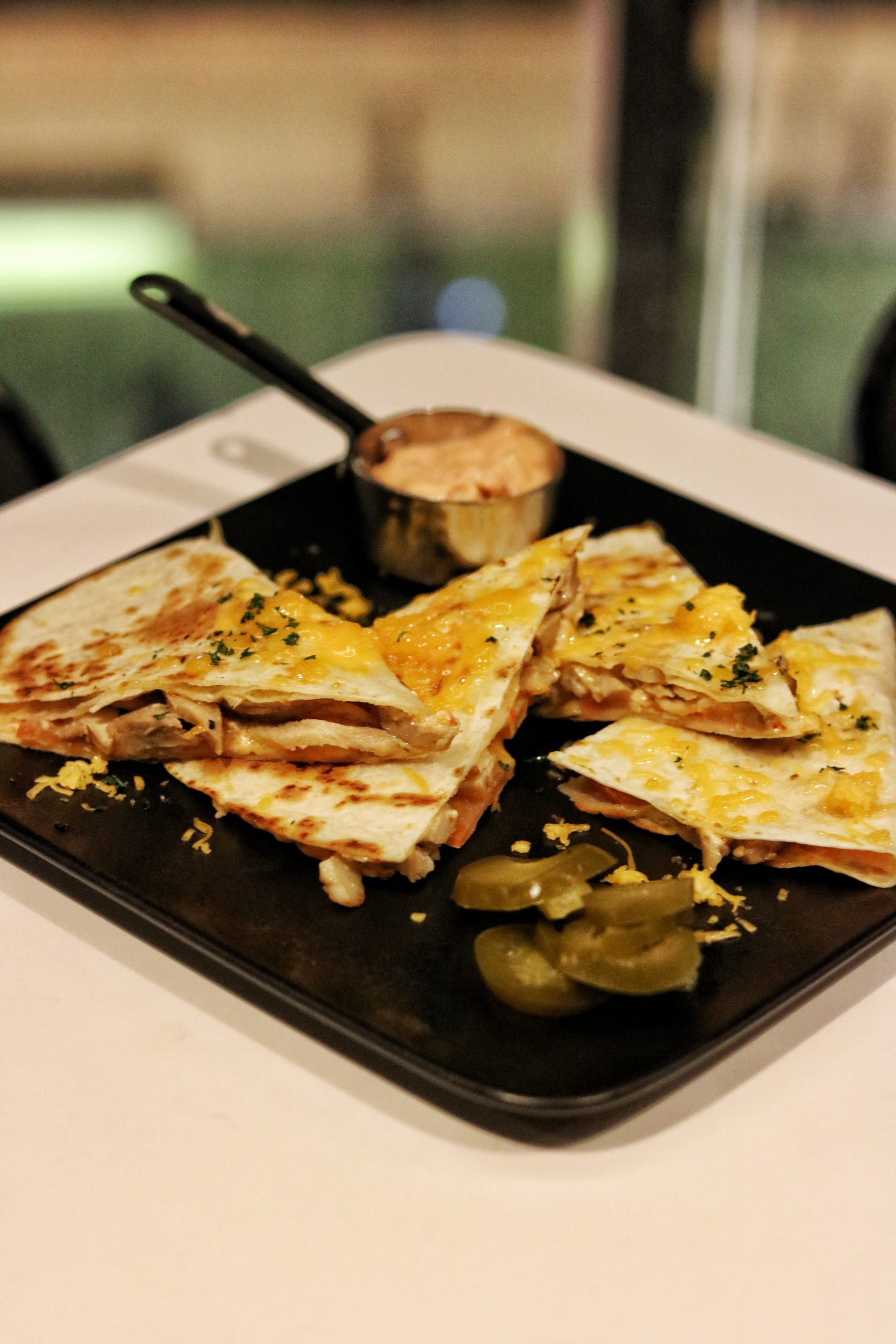 During our midweek dinner, we started with their bestselling guacamole with nacho chips and chicken quesadillas for starers. The guac was prepared live at the table in a giant stone mortar and pestle, and it tasted so good. The quesadillas were fair, but I didn’t quite like the taste of the chicken on its own and had to douse it in the jalapeno sauce on the side in order to mask the blandness. For the next course, we tried one of their signature burgers – Ketch Up burger that stacked with a large beef patty, their special sauce, and all those crunchy and creamy burger toppings. I loved the portion of this one. Along with the indulgent burger, we also tried the light and healthy shrimp bowl that featured mixed rice as a base along with avocado, mangoes, grilled veggies and more. The bowl was super filling and very wholesome – a great choice for those who want to eat something less guilty. But since we hardly ever think about guilt, we upped our mains with a side of fiery fries. Loaded with cheesy sauce and jalapenos, these were such good starchy accompaniments to the carbs. My next time choice for fries would definitely be the truffle ones. To be very honest, desserts were not really on the cards, but the staff insisted we try their caramel ice cream cake, and so we did. Along with that, we also ordered a tall Oreo shake which came in a monster size. The milkshake was great – both in terms of taste as well as presentation, however if I had to choose dessert, I would go with something different next time instead of the ice cream cake.