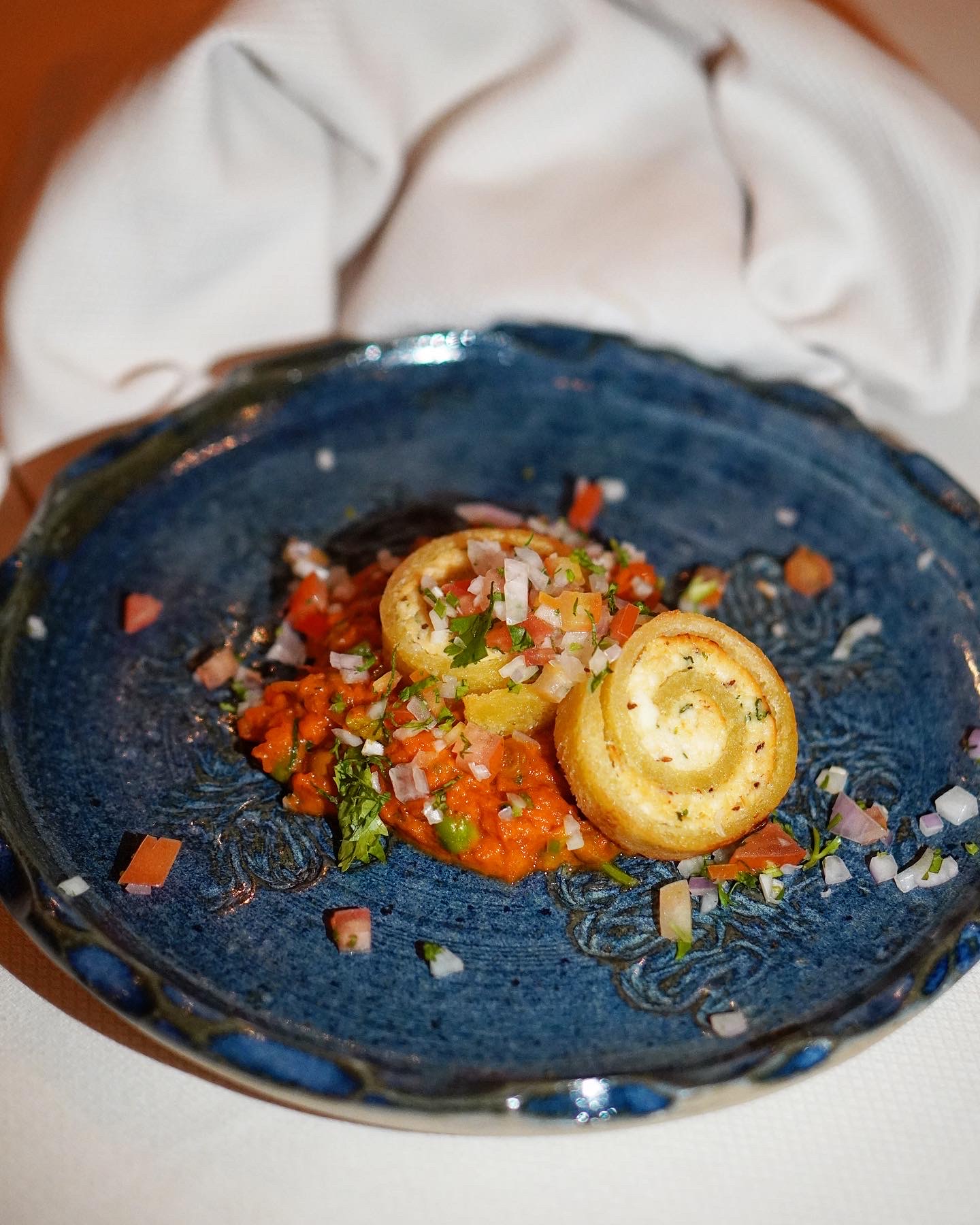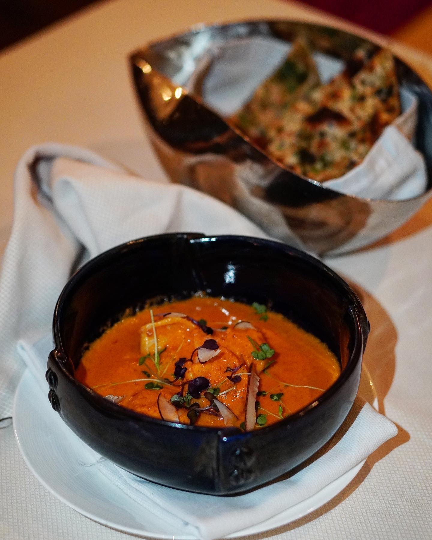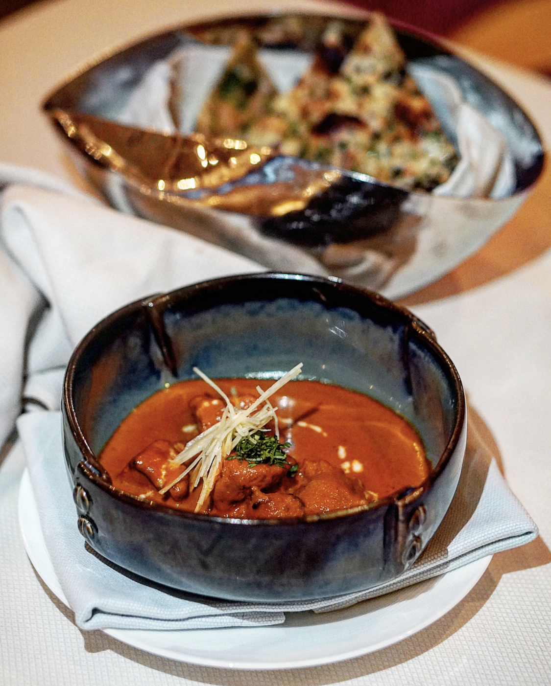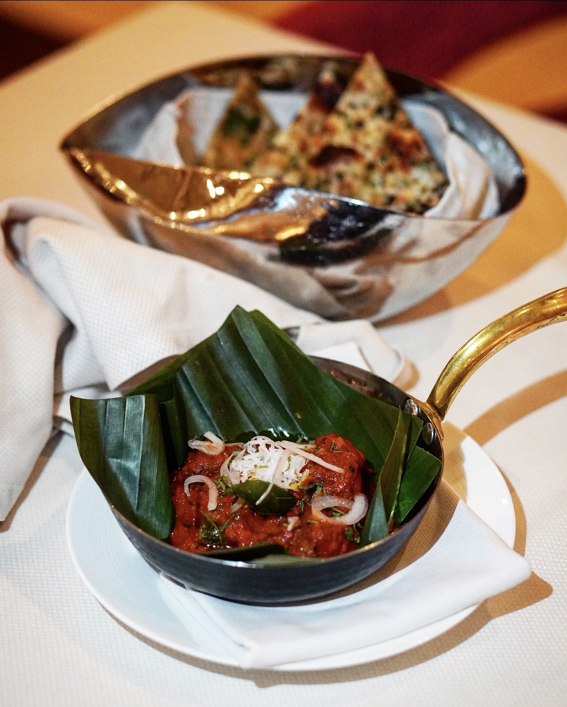We started with the signature mocktail called One Night in Kerala which was a refreshing blend of passion fruit and South Indian spices (think curry leaves). Along with the drink came in the papad basket with a chutney trio and the amuse bouche of the day, which featured a sesame crusted veg tikki placed over a bed of bell pepper chutney. Their amuse bouche changes everyday, which I feel is a remarkable, at the same time challenging feat.
