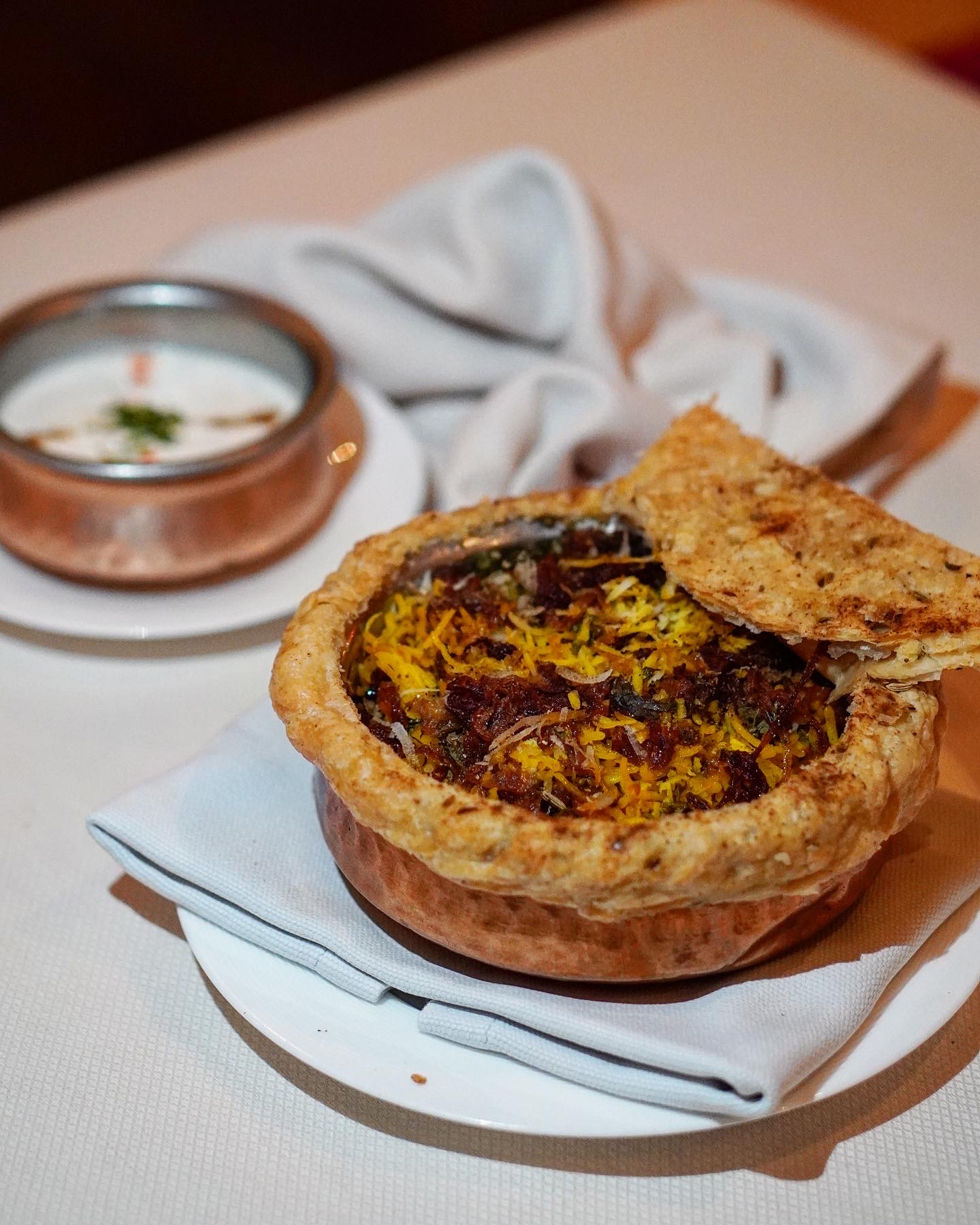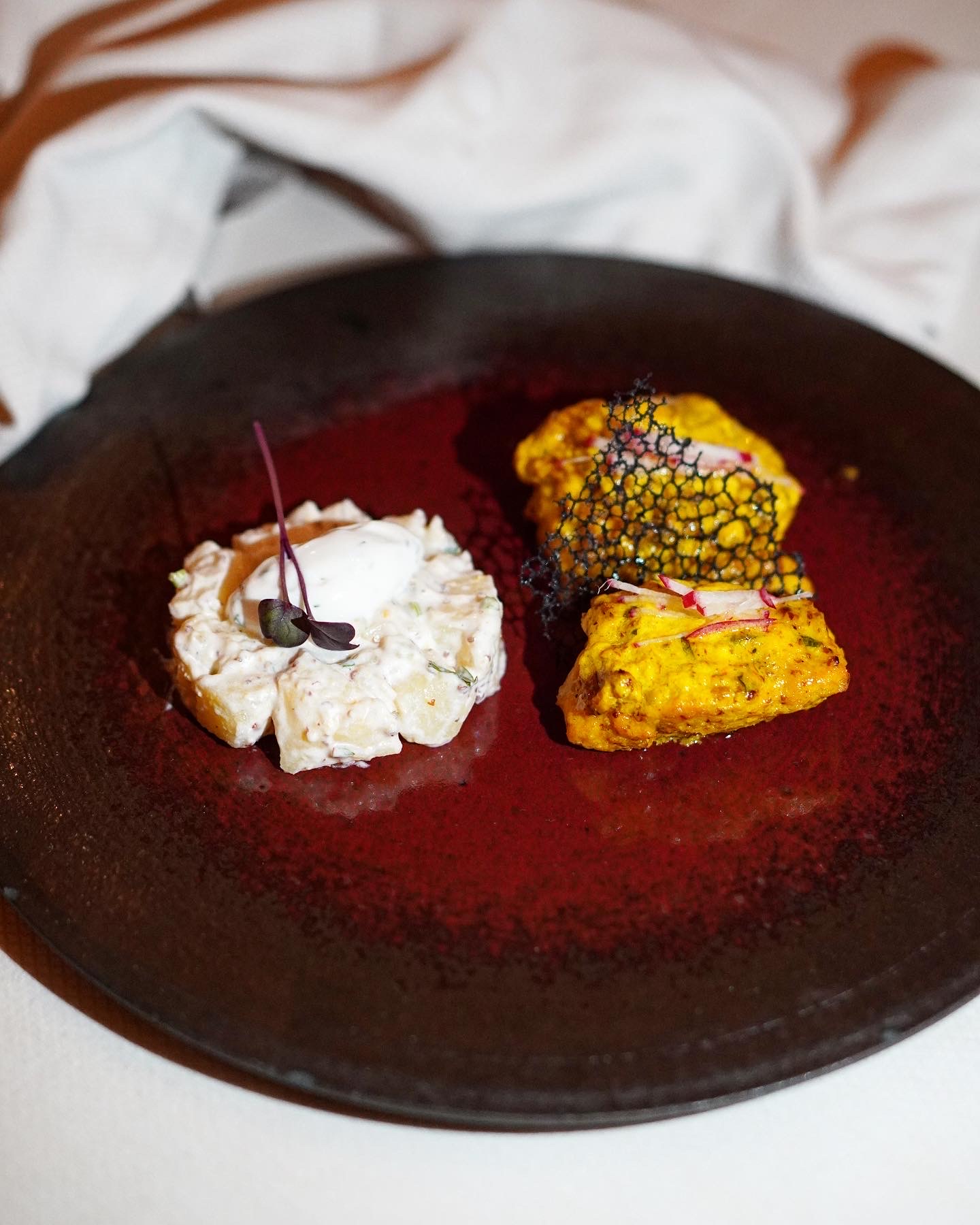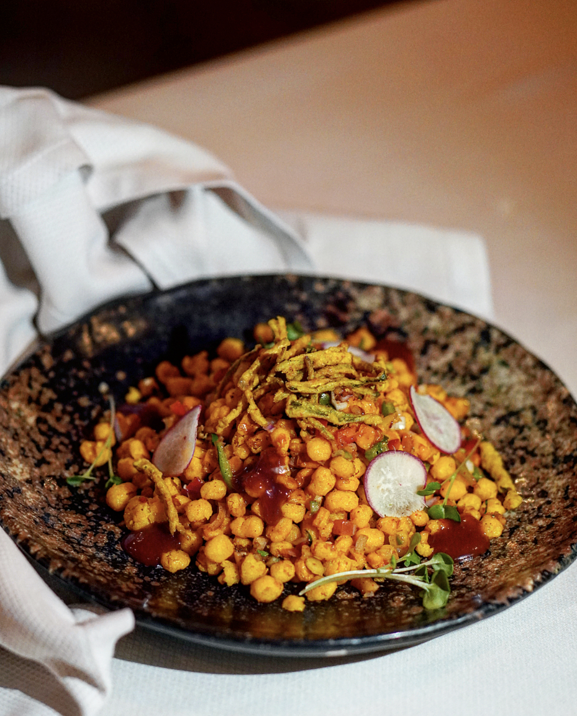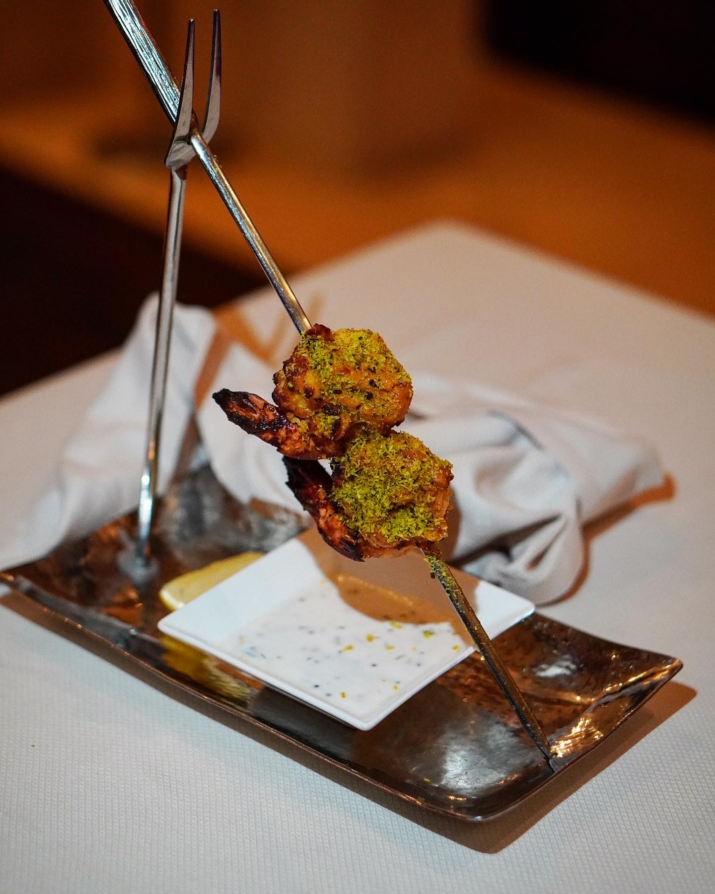 Our list of starters started with Corn Cravings – a creative style of tikki chaat prepared with a base of sweet corn tikkis topped with crispy corn kernels in chaat style and finished with crisp okra. Next on the list was one of my favorites, Chowpatty Bhaji – a true spin on the classic Juhu style pav bhaji, albeit with pav and chhena (curd cheese) pinwheels placed delicately over the spiced bhaji. Southern Seas came in next all skewered up with gunpowder coated prawns and a delectable coconut chutney dip on the side. This one was another favorite, not only because of the prawns, but also that coconut chutney which I saved for later just to eat it on its own. Our starters continued with yet another chaat spin, this time a Samosa Doughnut. Your typical samosa, but made in a doughnut style, replicated the classic samosa chaat featuring all the trimmings of chickpeas, yogurt, spicy and sweet chutneys, et al. Smoked Chicken Tikka was another classic on the menu, the twist here being the smoked tomato and red pepper flavor, as well as the black garlic raita. Another one of my favorites, despite my love-hate relationship with fish was the FIsh Kasundi. A Bengali classic, this tandoori smoked mustard flavored dish came accompanied with a mustard potatoes side topped with a dill based labneh.