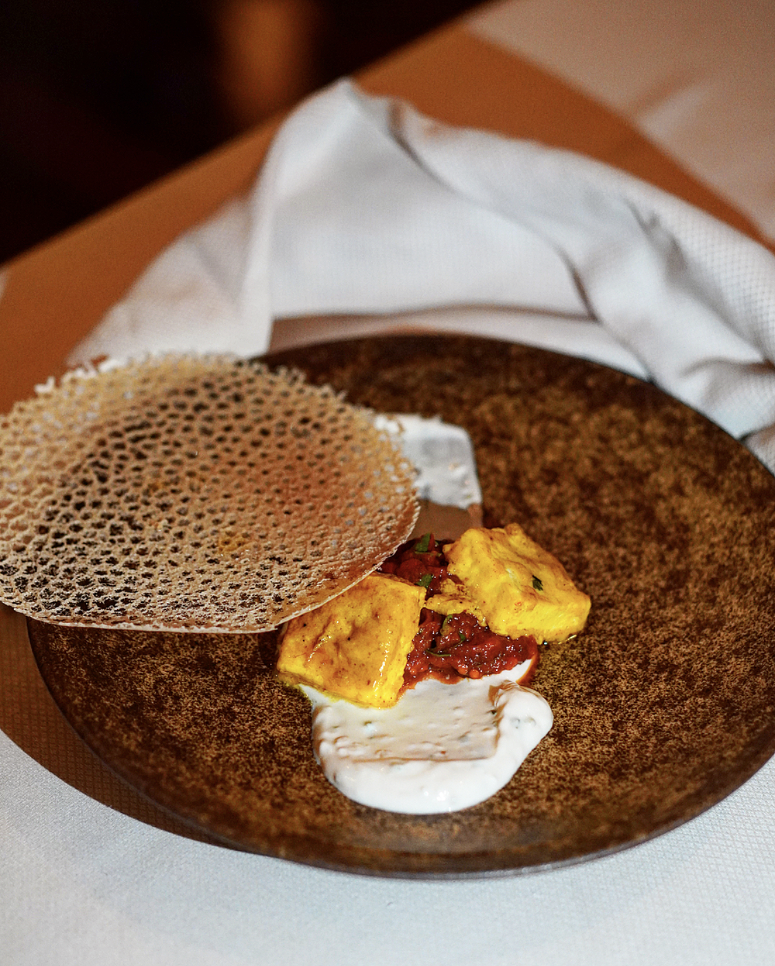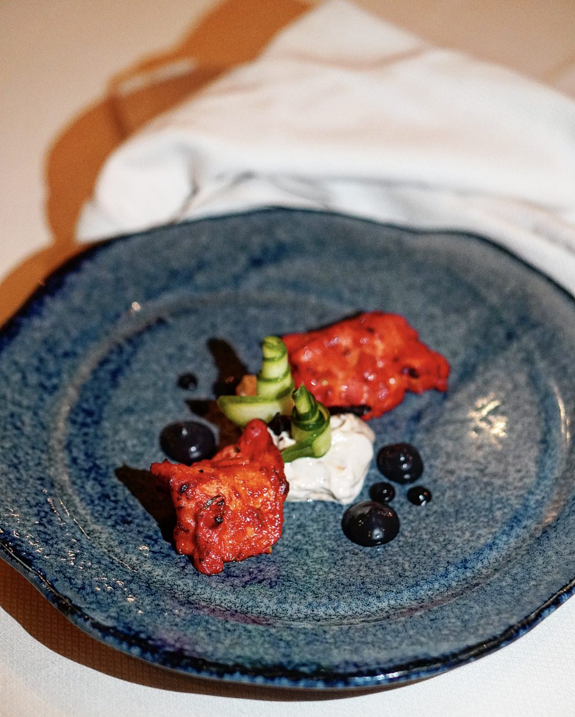 You might think that was the end to the starters, but we had 3 more to go. The next one, and my ultimate favorite from the evening, was Chaat Trilogy. A true representation of the food we have come to expect from celebrity chefs and fine dine Indian restaurants these days, this creatively structured dish featured a trio of three famous chaats, starting with a bed of spiced potatoes, followed by papdi hay (imitating a papdi chaat), and ultimately topped with a dahi bhalla ice cream. Needless to say, the ice cream was my favorite. Then came in the Gilafi Seekh in all its herb flavored glory and melt-in-your-mouth lamb mince. We wrapped up this first round of dishes with the humble Paneer Pasanda. An otherwise main course dish that was reinvented as a starter, this dish came with tandoori paneer, coated in homemade pickle and served over a burnt aubergine spinach compote and garlic labneh. What I loved the most about its presentation was the wheat coral on top.